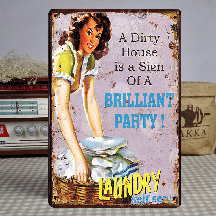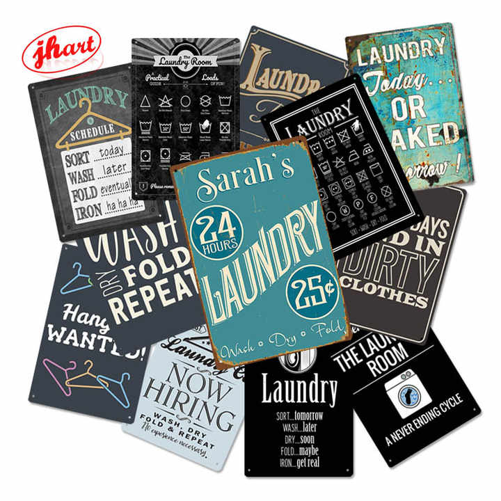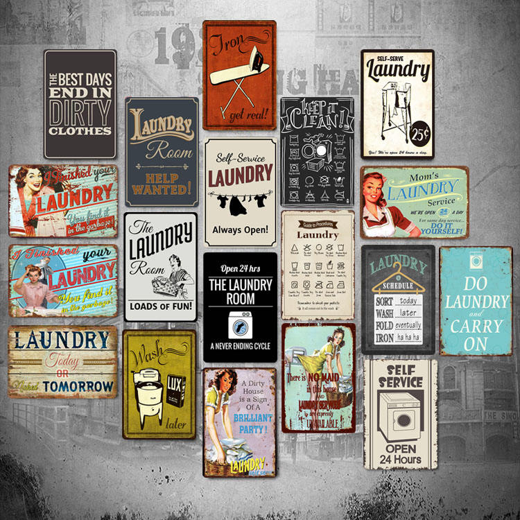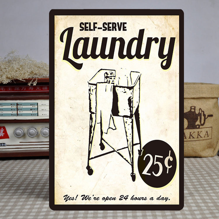 Targa in Metallo Vintage per Lavanderia, Decorazione per Locale Lavanderia, Insegna in Latta 'Aperto 24 Ore', Placca Metallica 'Lavaggio Asciugatura Piegatura Ripeti'
