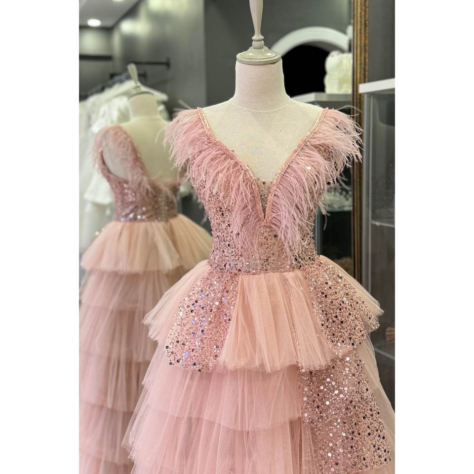 Abito da Sera e da Notte Lungo in Tulle con Dettagli in Pizzo e Piume Color Polvere