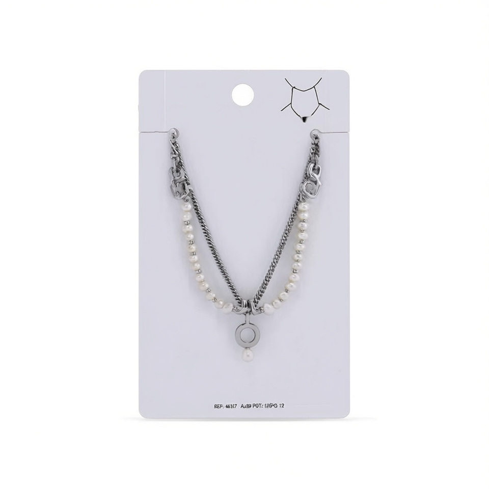 Collana a Strati con Perle, Ciondolo in Acciaio Inossidabile Color Acciaio, Gioiello con Doppia Catena