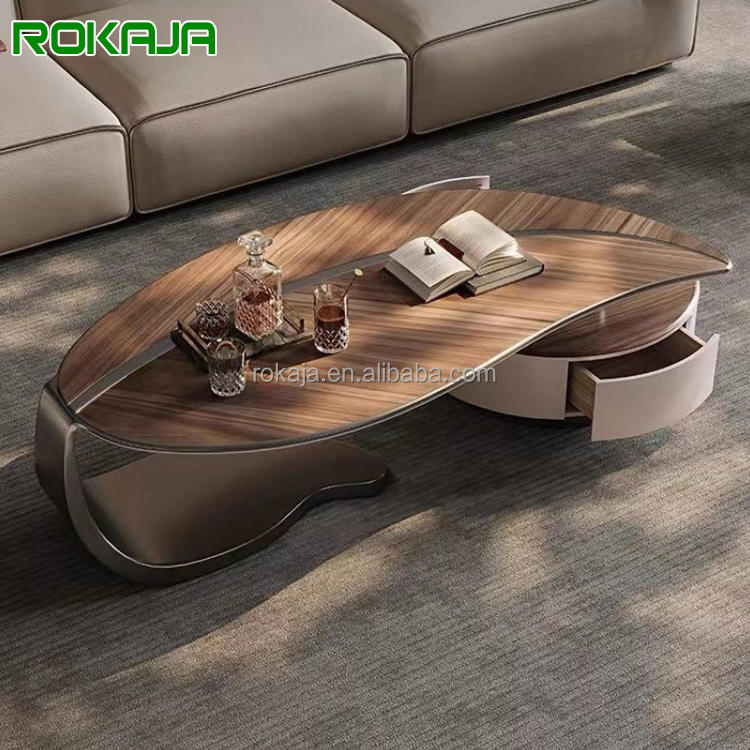 Tavolino da Caffè con Design a Foglia, Base in Metallo Dorato e Piano in Legno Massello, Tavolo da Tè in Stile Moderno con Cassetto