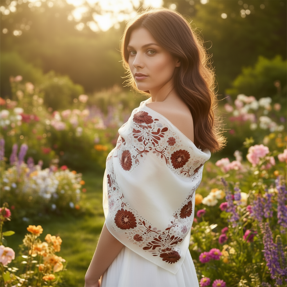Foulard quadrato piccolo a forma di foglia 70x70 cm con ricamo floreale per donna, accessorio moda