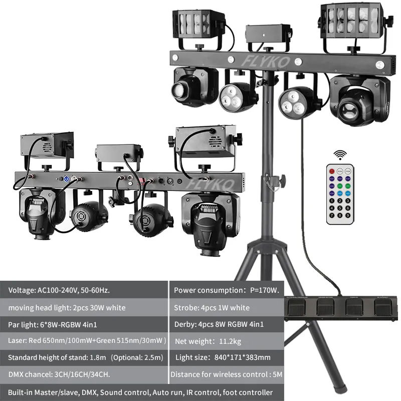 Modalità di controllo:Master/slave, DMX, Controllo sonoro, Auto, Controllo IR, Pedale