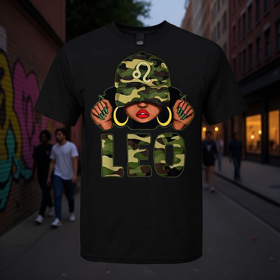 T-shirt Nera da Donna con Stampa Regina Leone Afroamericana con Cappello Mimetico - Prodotto Promozionale