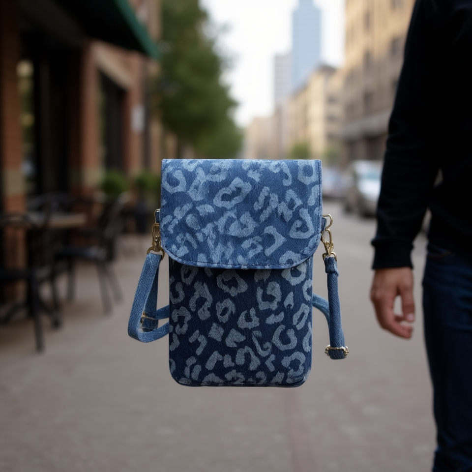 Realizzata in denim di alta qualità per una maggiore resistenza e una texture morbida. Borsa per telefono in denim con stampa leopardata 19x2x12cm per cellulare.