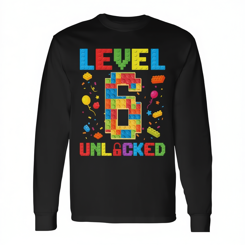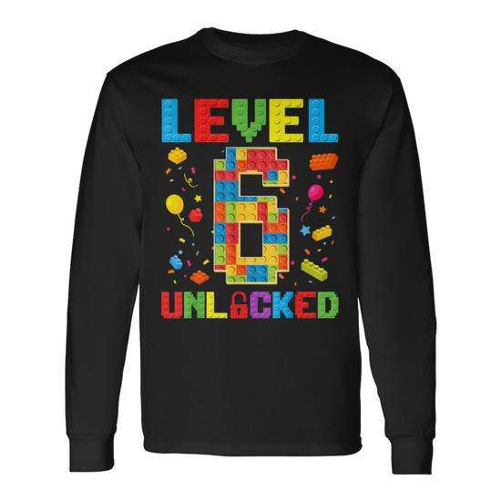 T-shirt promozionale a maniche lunghe Level 6 Unlocked 6th Birthday Boy Master Builder Blocks