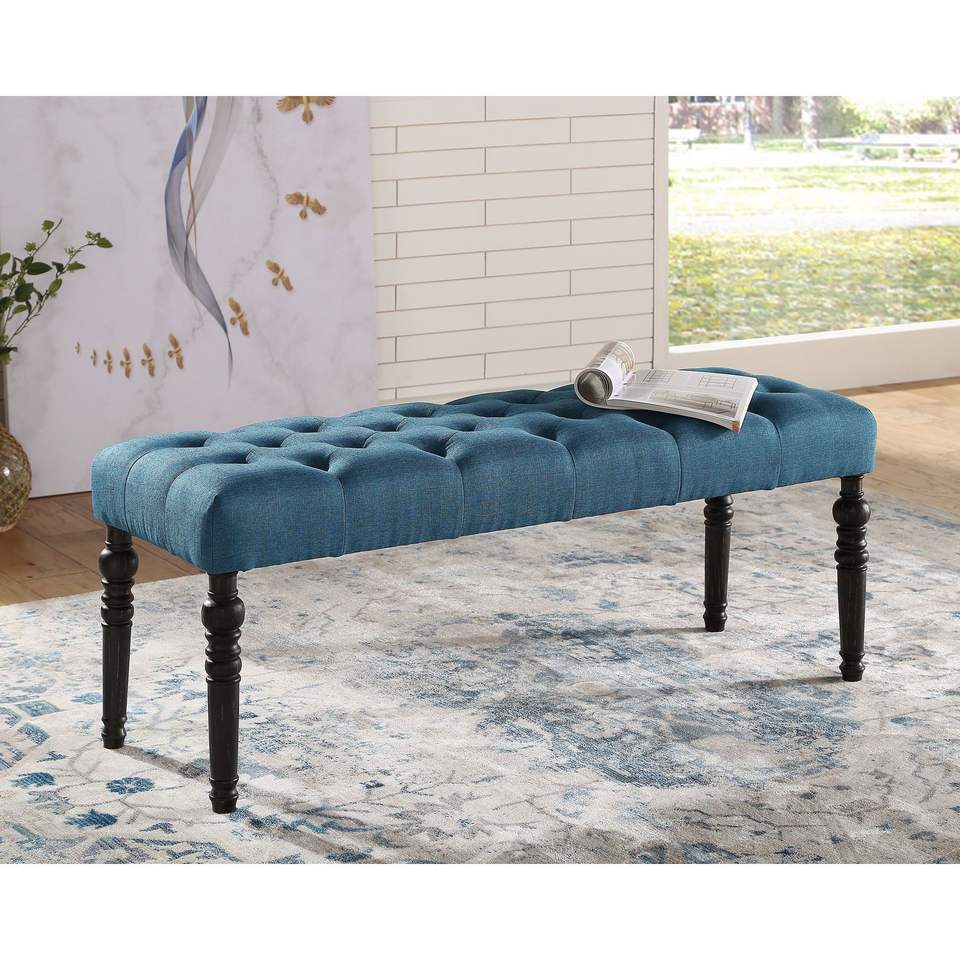 Panca da pranzo in tessuto Leviton con gambe tornite blu-per i mobili della tua sala da pranzo