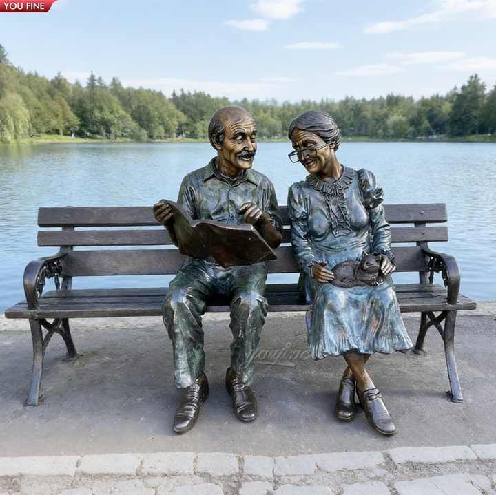 YOUFINE Statua in Bronzo a Grandezza Naturale di Coppia di Anziani Seduti su Panchina per Arte Pubblica all'Aperto