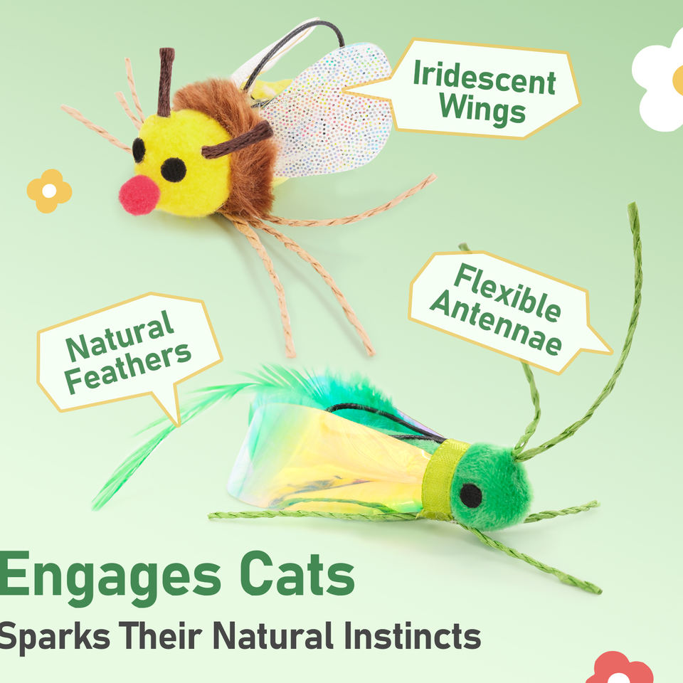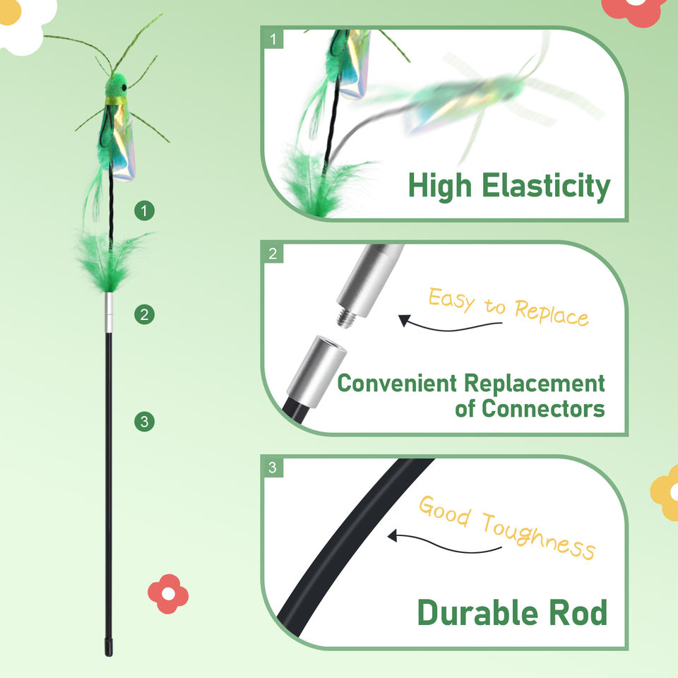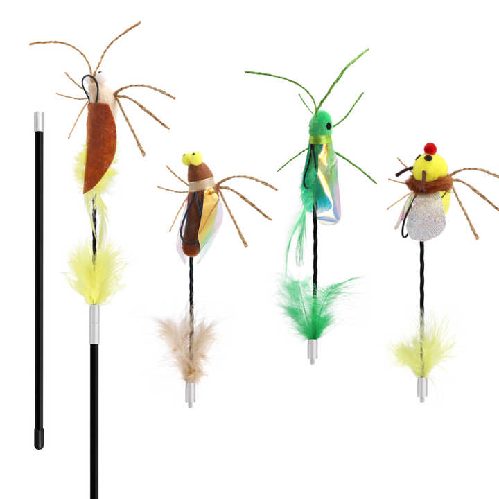 Set di ricariche per bacchette teaser per gatti con insetti realistici, ali iridescenti e piume naturali, durevoli, per prolungare la durata della bacchetta a spirale