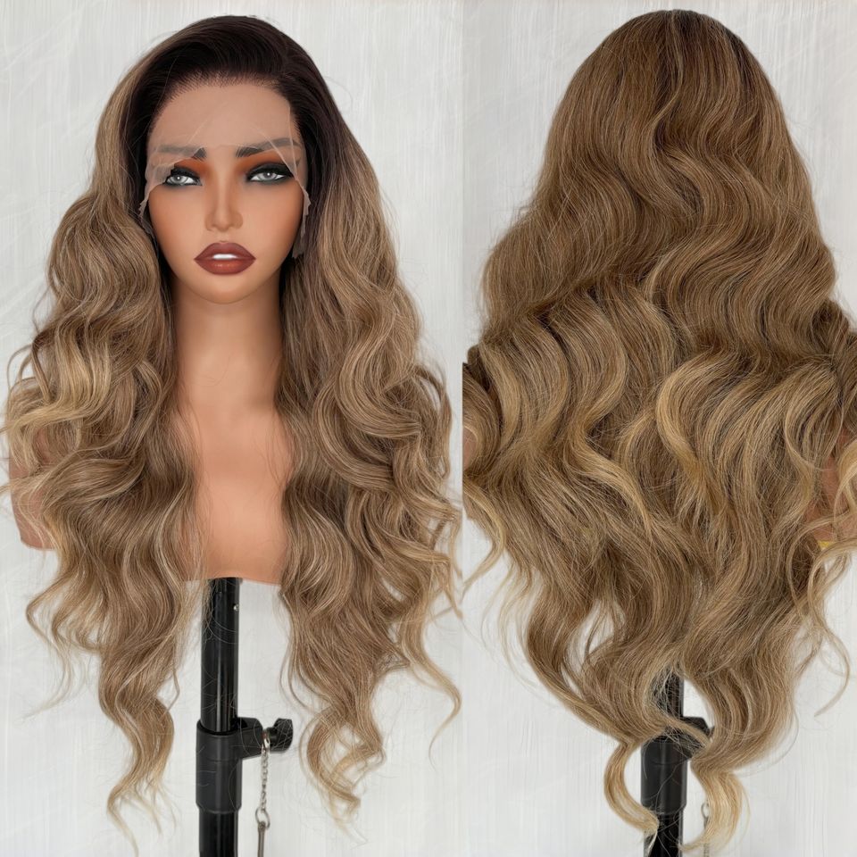 Parrucca Sintetica Lace Front 13x6 di Alta Qualità, Resistente al Calore, Lunga Onda Corporea Riccia, Colore Marrone Chiaro Cenere, Parrucche Sintetiche Color Lino