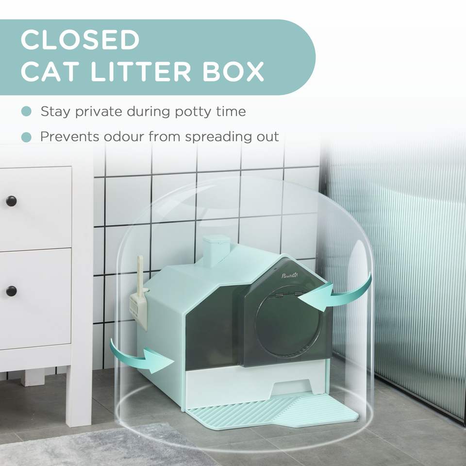 Light Blue Hooded Cat Litter Box with Easy Clean Mat Particle Catching Feature Accessory Item