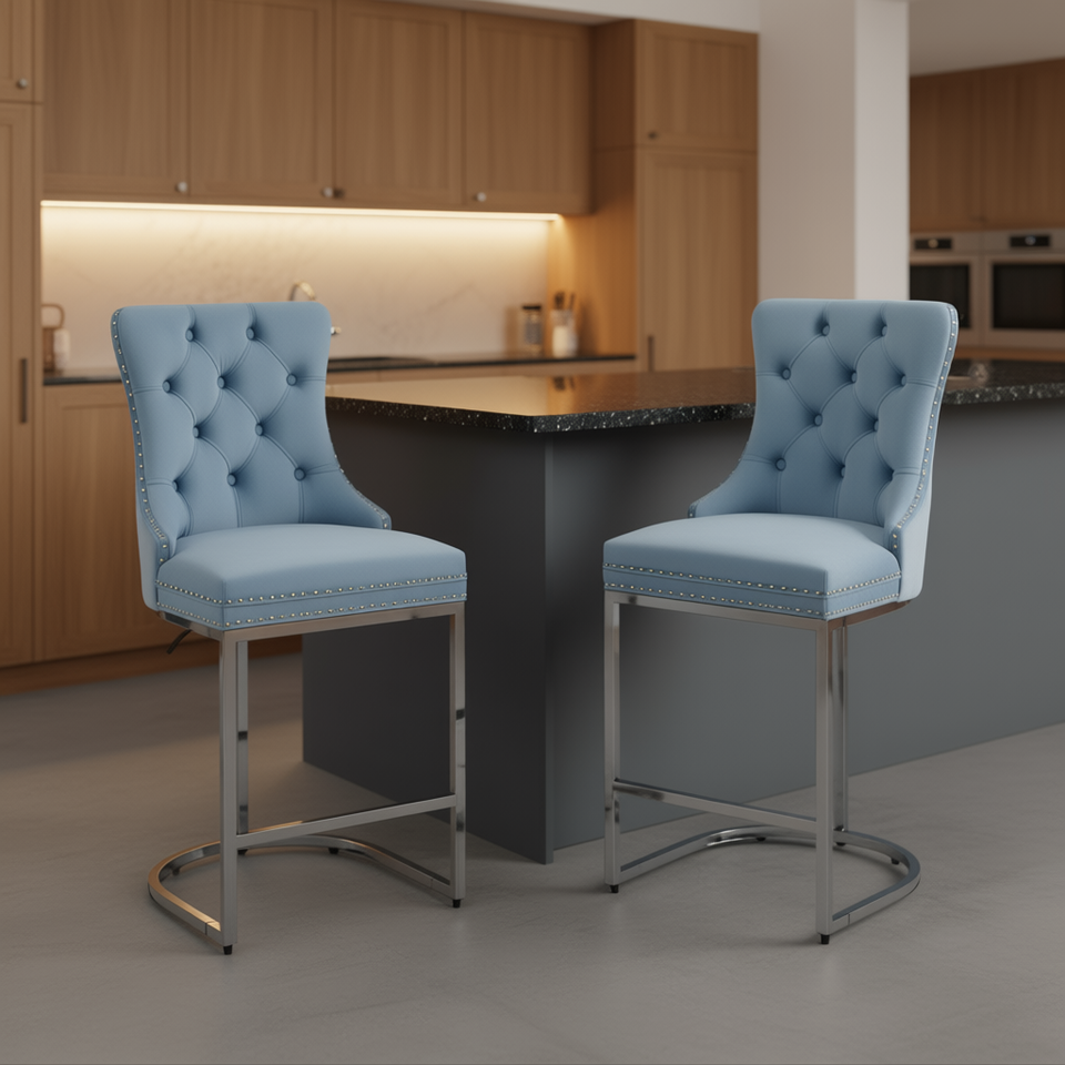 Set di 2 Sgabelli da Bar in Velluto Azzurro, Design Moderno con Schienale a Bottoni e Finitura a Rivetti, Base in Metallo Cromato, Sedie per Isola Cucina
