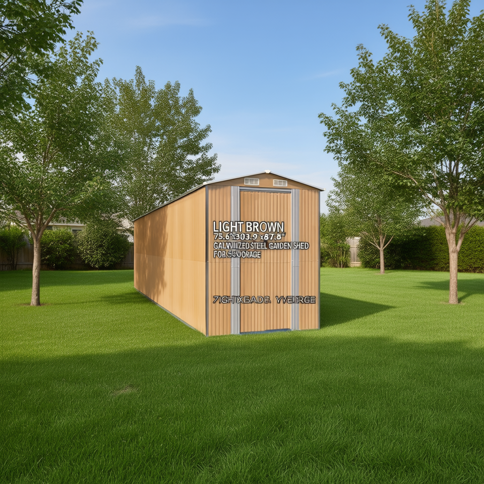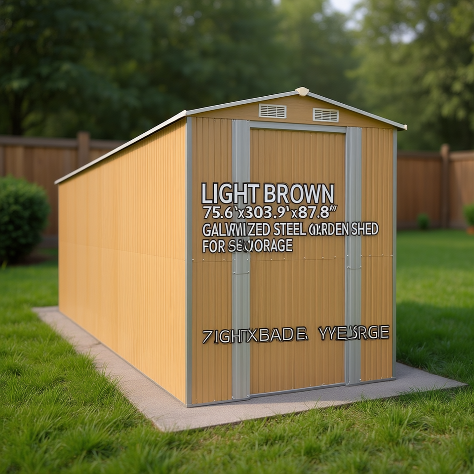 Casetta da Giardino in Acciaio Zincato Marrone Chiaro 75.6x303.9x87.8 Pollici, Capanno di Stoccaggio con Tetto a Falda Alta per Esterni