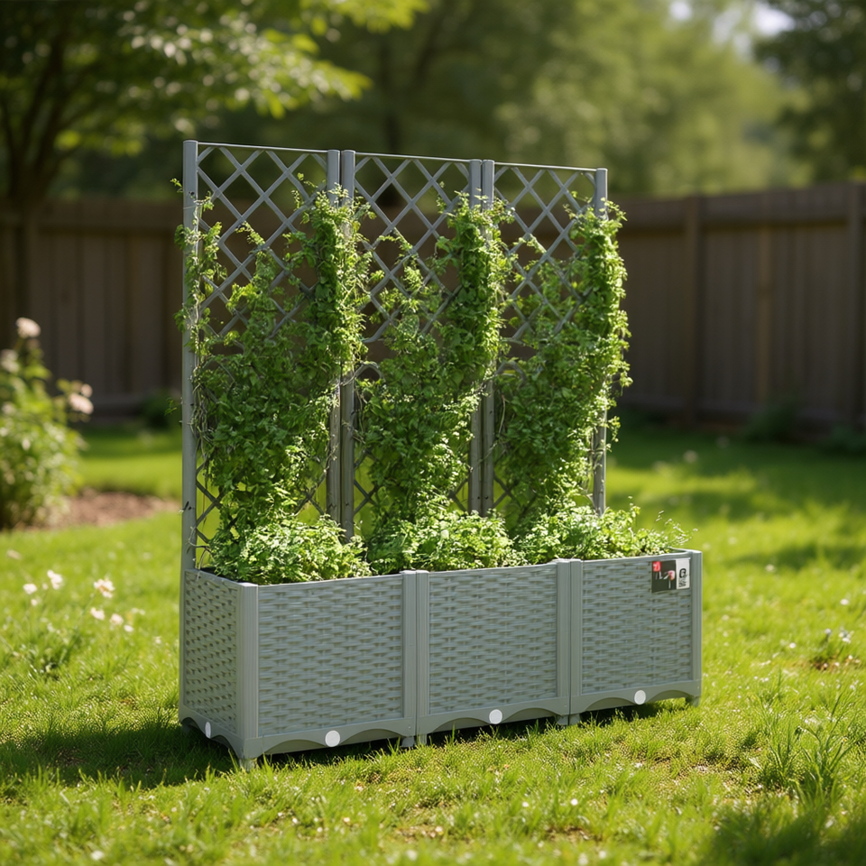 Fioriera da Giardino in PP Grigio Chiaro con Traliccio e Recinzione per Esterni, Resistente ai Raggi UV, Verniciata a Polvere, 47.2x15.7x53.5 per Giardini