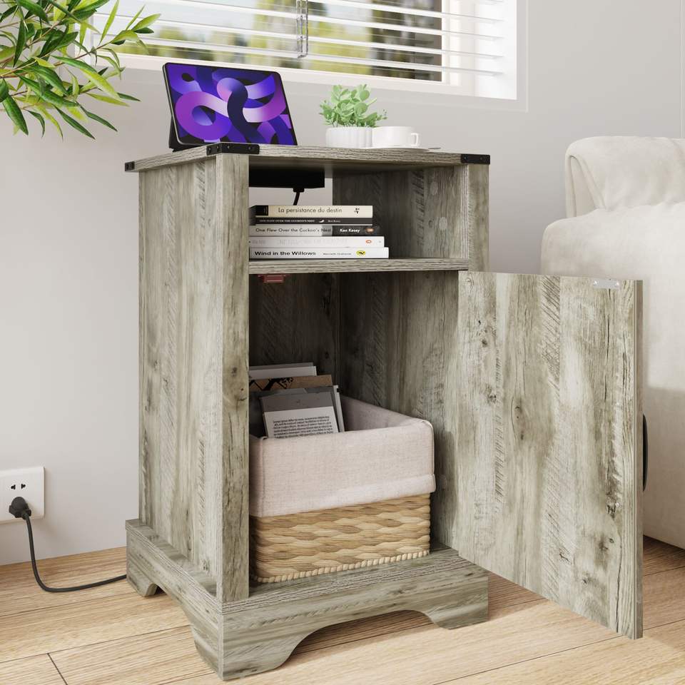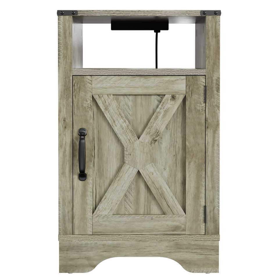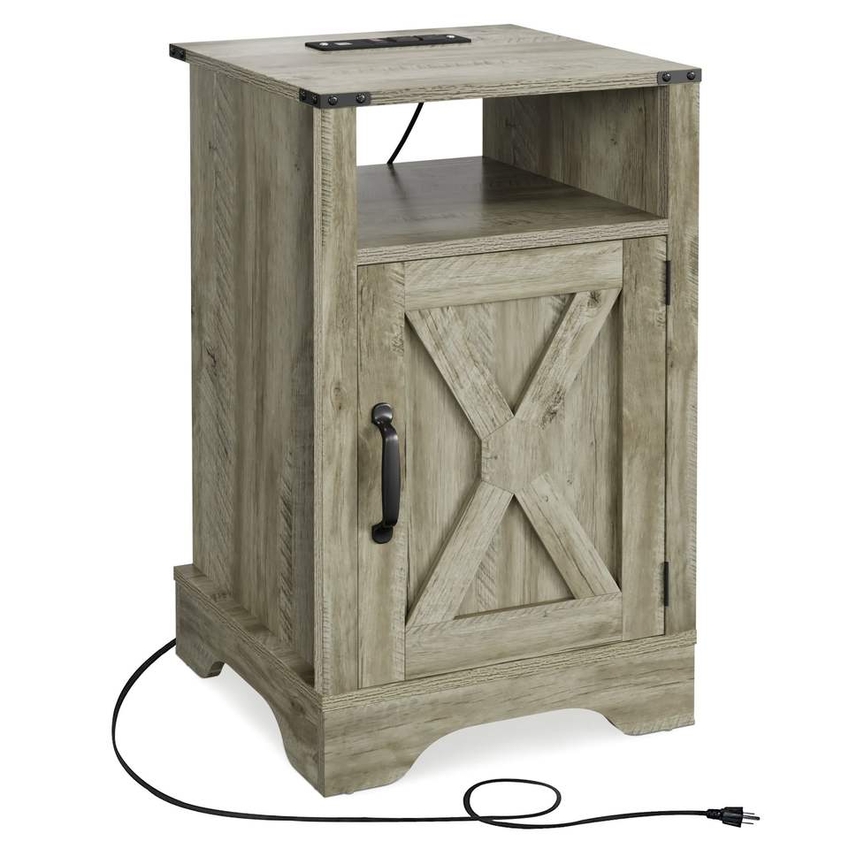 Comodino Rustico in Legno Grigio Chiaro Stile Fattoria con Prese Elettriche e Stazione di Ricarica