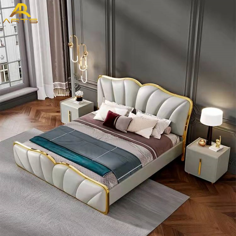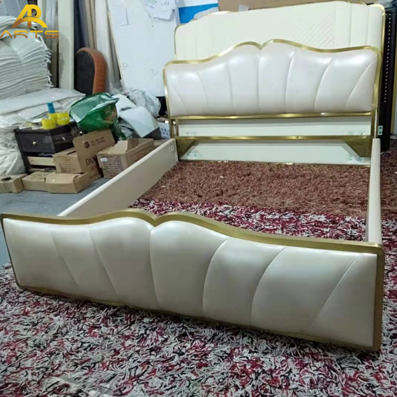 Luce di lusso dorato bordo in metallo morbido letto Queen Size moderna di lusso testiera in pelle cuscini su-fondina letto King Size
