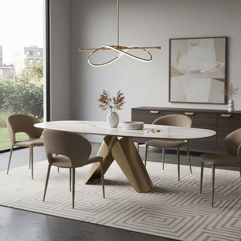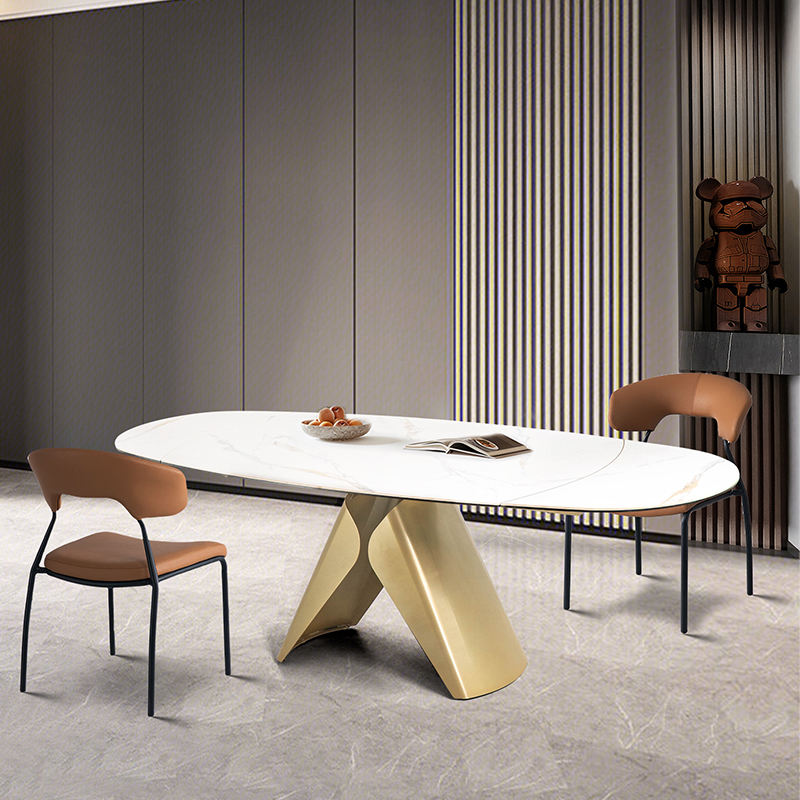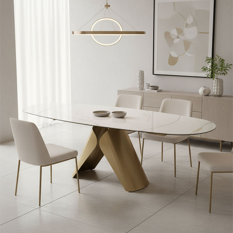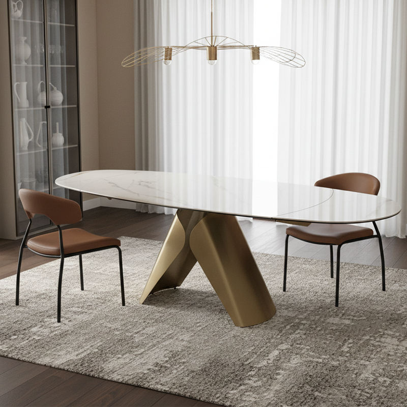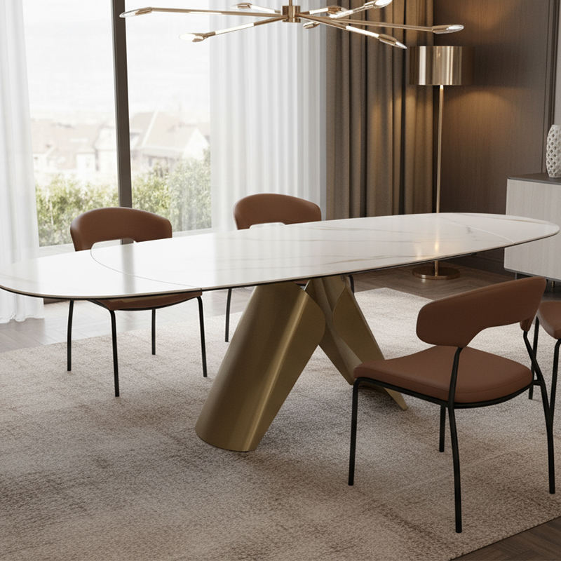 Tavolo da Pranzo Allungabile Ovale di Lusso Leggero in Stile Nordico con Piano in Pietra Sinterizzata e Base Dorata