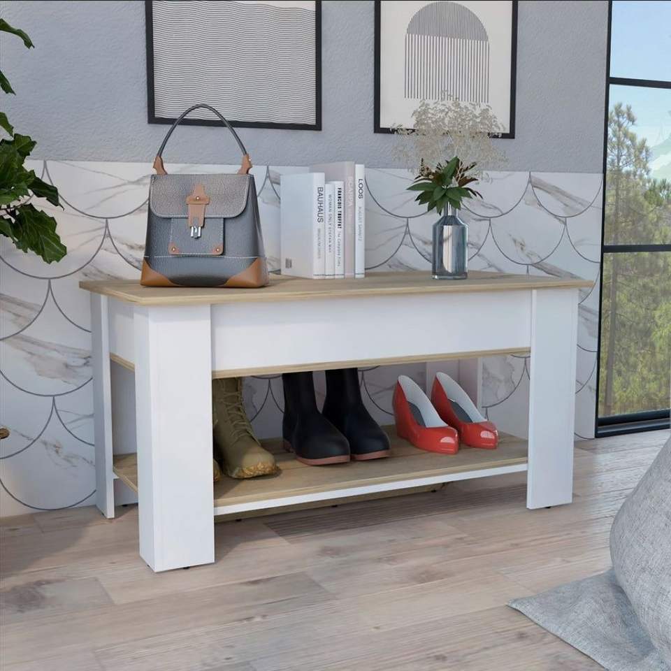 Tavolo da tavolo allungabile con finitura in rovere chiaro/bianco con poligono inferiore mensola per scarpiera soluzione di stoccaggio