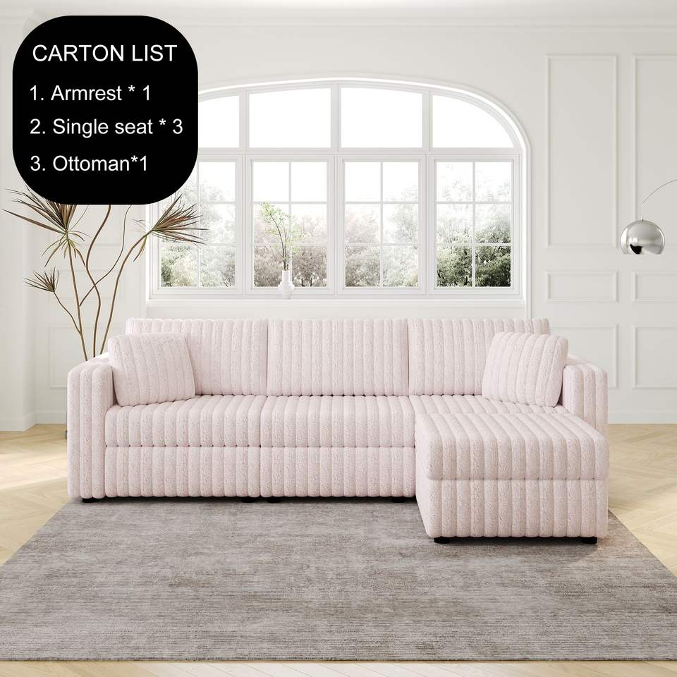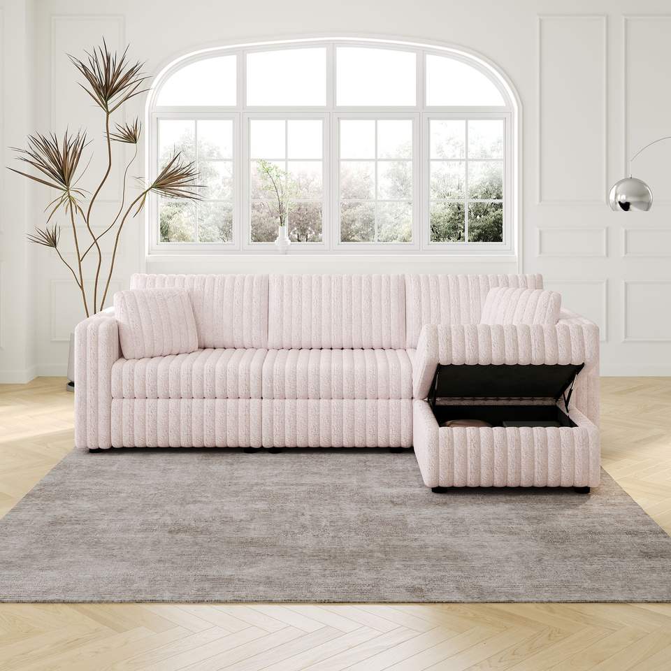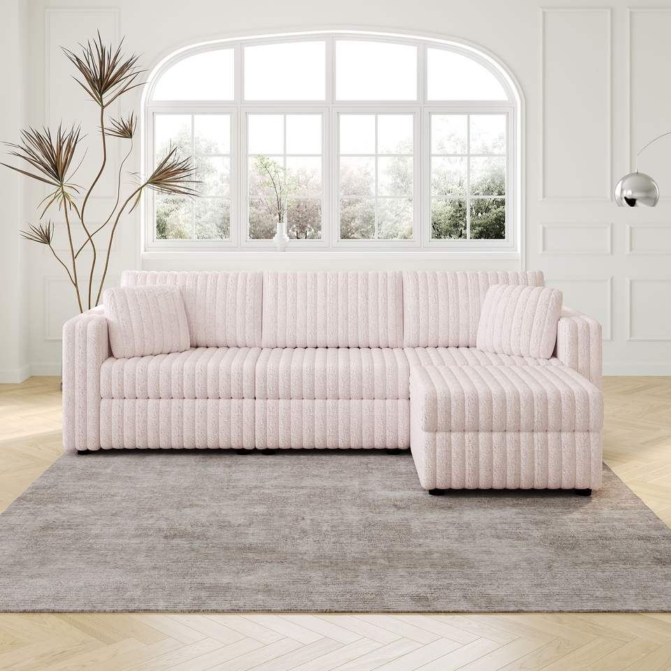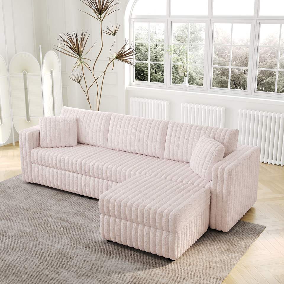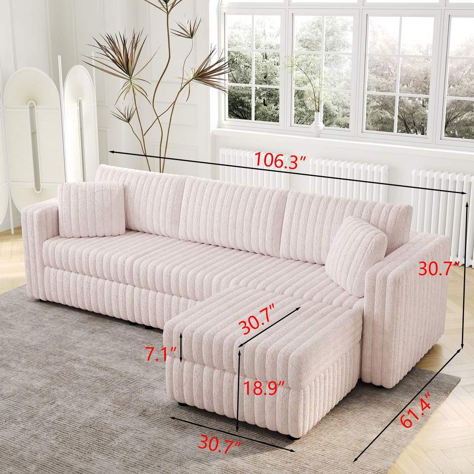 Divano Morbido Rosa Chiaro da 270 cm per 3 Persone con Elegante Pouf Sollevabile Idraulico da 78 cm, Comodo Arredamento per Soggiorno e Camere da Letto