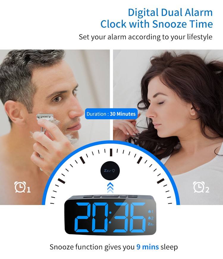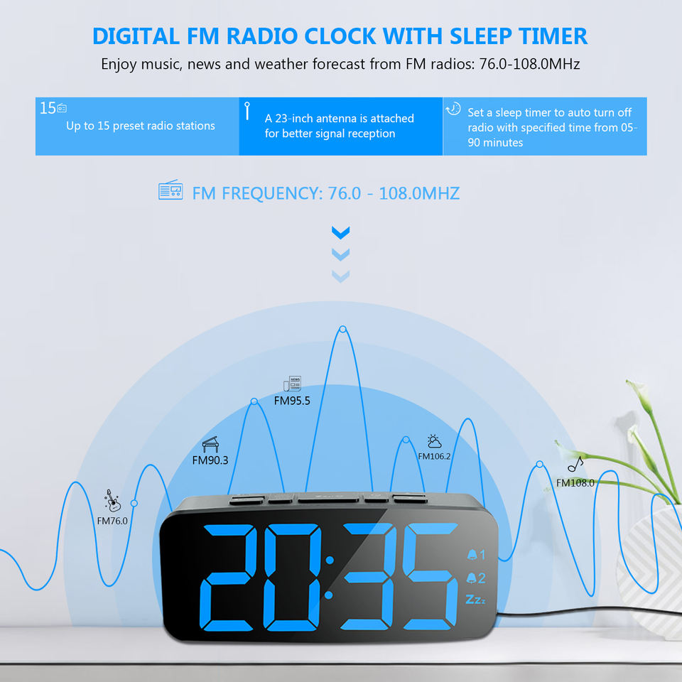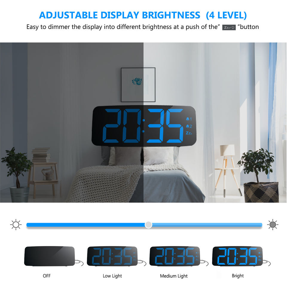 Orologio Digitale LED Radiocomandato con Grande Display Blu, Radio FM Portatile, Sei Livelli di Controllo Luminosità, Sveglia 155*42*52mm