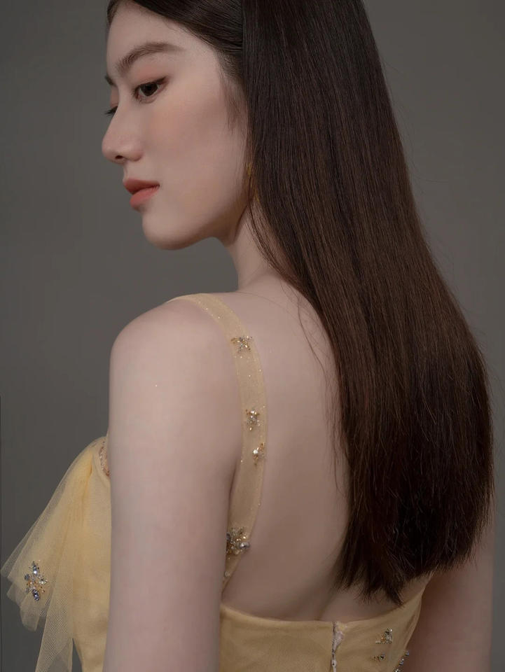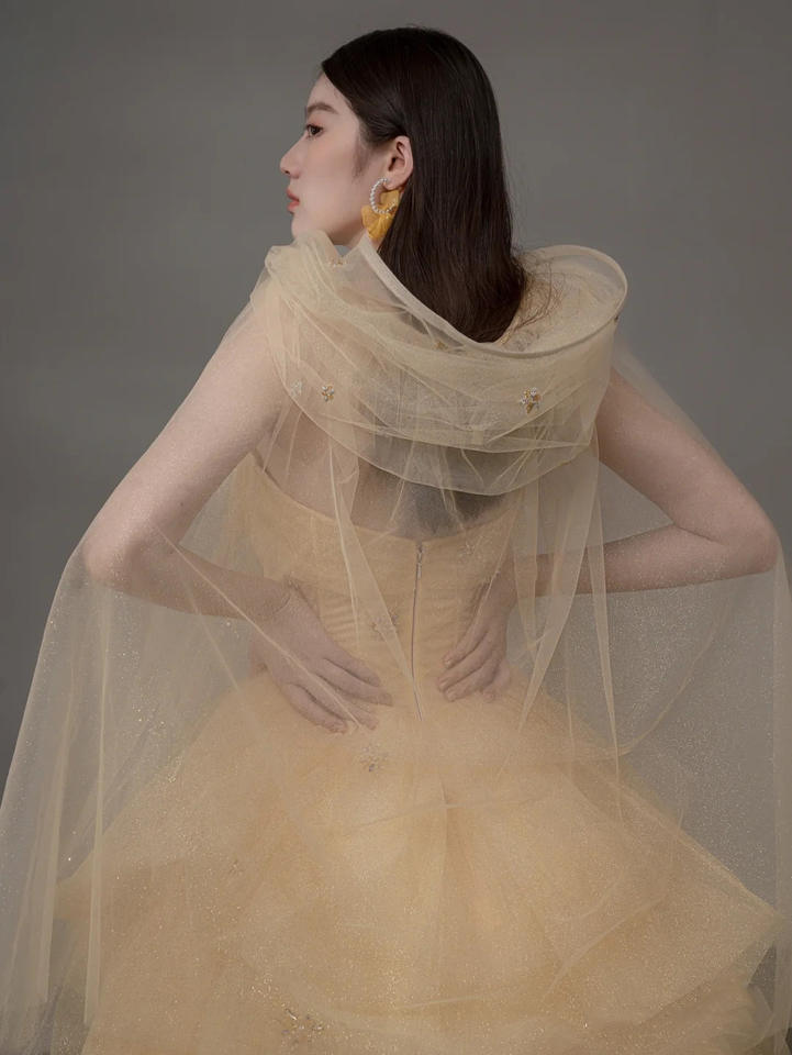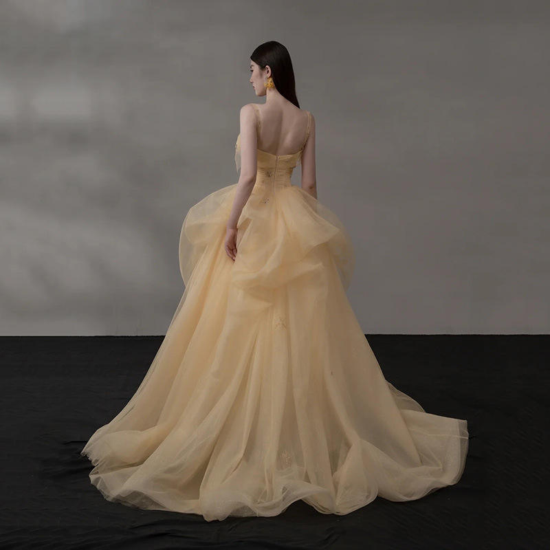Light Yellow Ladies Elegant Sleeveless Backless Tulle Prom Grown up Ceremony Party Ball Gown Evening Dresses