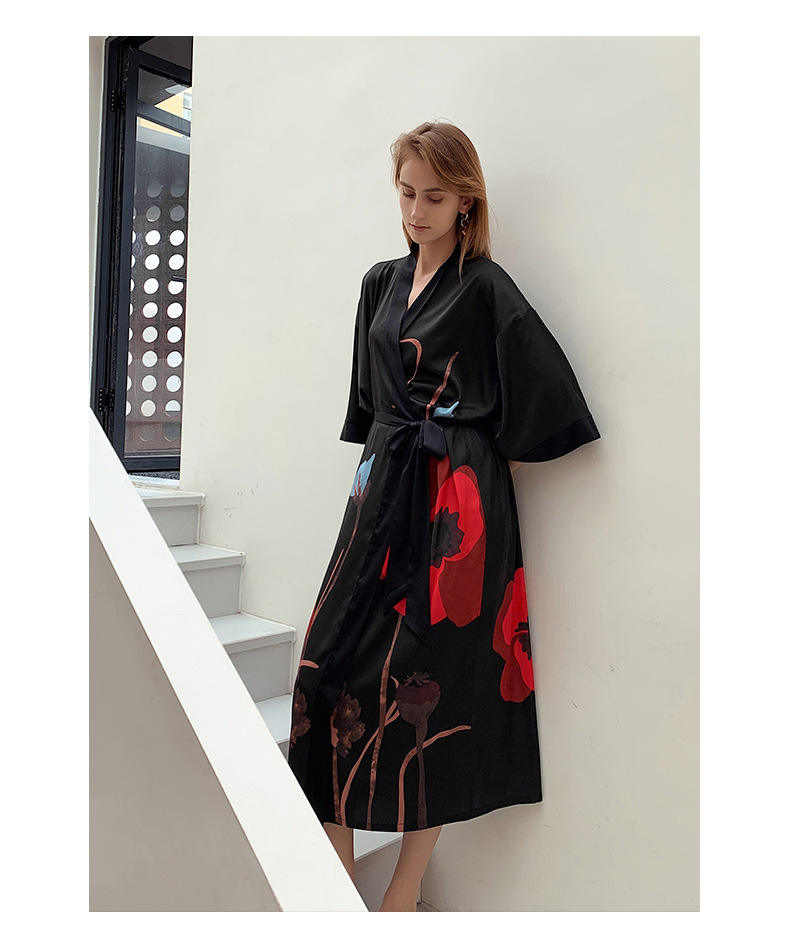 Pigiama di Lusso in Stile Cinese con Maniche a Tre Quarti, Vestaglia Lunga in Raso Stampato, Abbigliamento da Notte