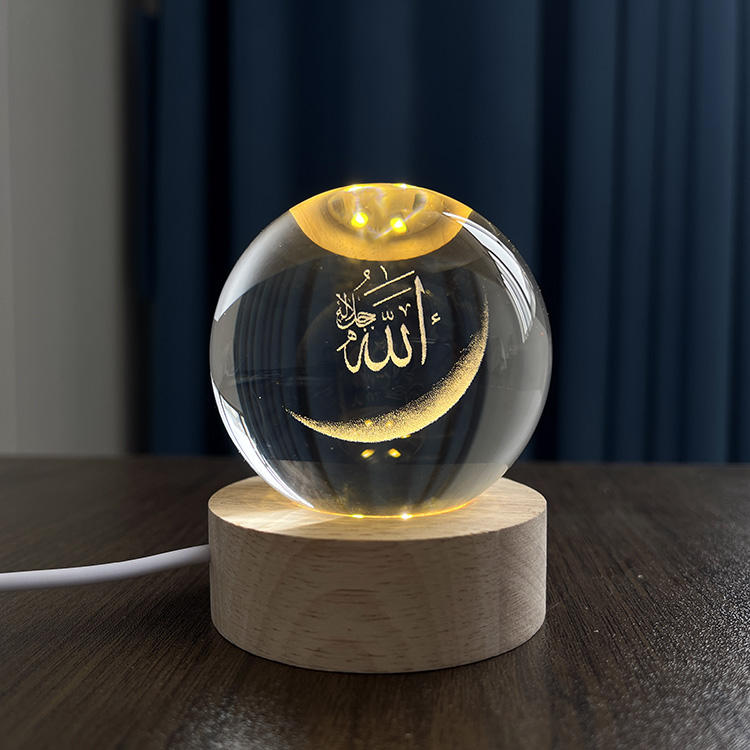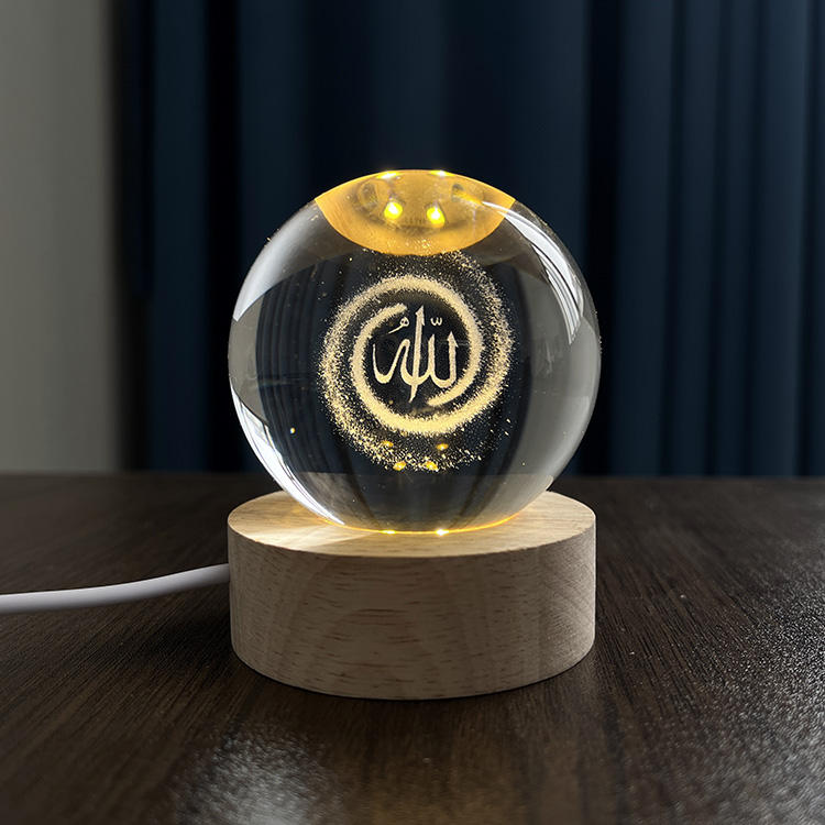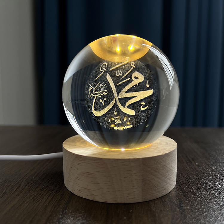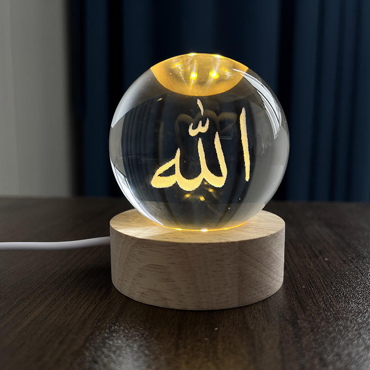 Sfera di Cristallo Luminosa con Incisione Laser Allah Mohammed Souvenir Islamico con Base in Legno a Luce LED MH-Q0251