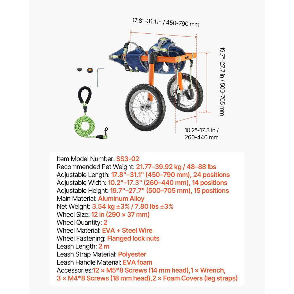 Carrozzina Manuale Leggera a 2 Ruote per Cani, Regolabile in Altezza, Larghezza e Lunghezza, Carrello Ammortizzato per Zampe Posteriori