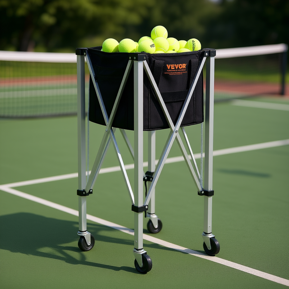Vevor Tennis Ball Hopper Basket Cart 150-Ball Capacity Foldable Aluminum Alloy With Wheels For Training Outdoor Use