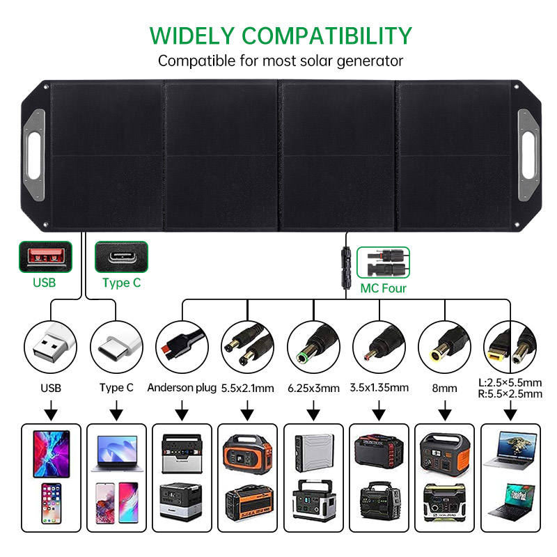 Caricatore Solare Portatile Leggero Full Black Back Contact Tech 100W 120W 150W 200W con USB-A USB-C per Power Station