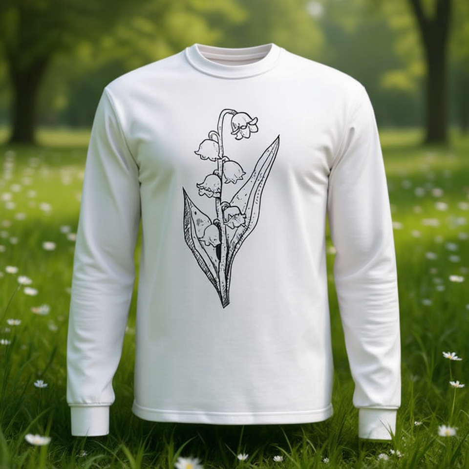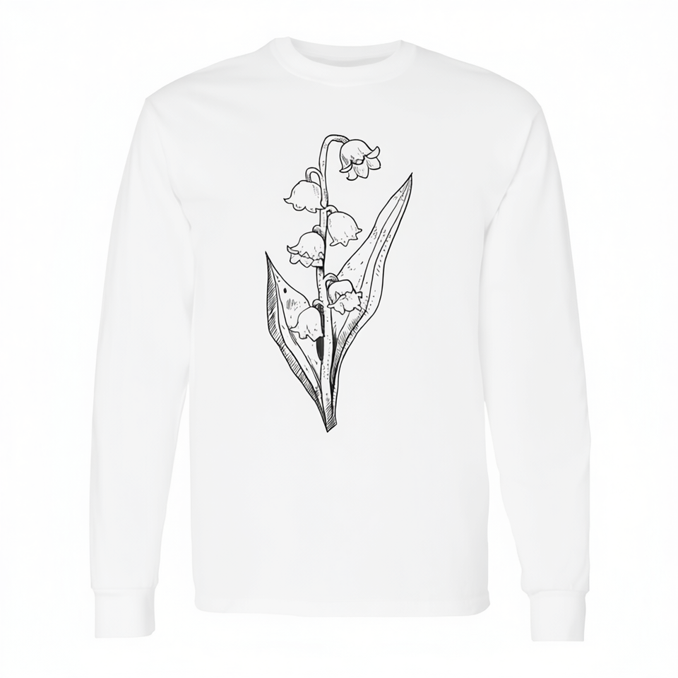 T-shirt a maniche lunghe con illustrazione di lily of the valley, design floreale da giardino con fiori selvatici