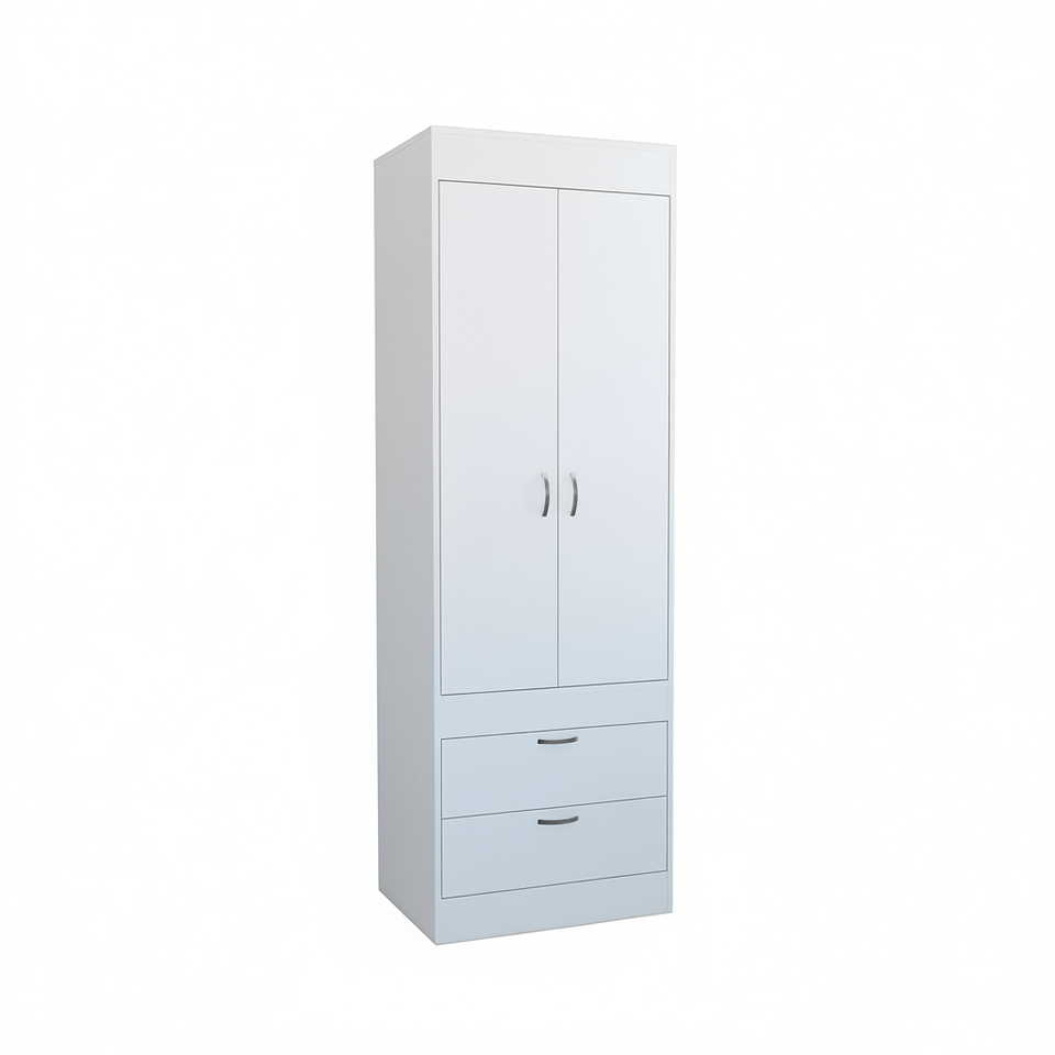 Armadio Bianco Lisboa con Doppie Ante e Due Cassetti, Maniglie in Metallo, Guardaroba Moderno per Camera da Letto