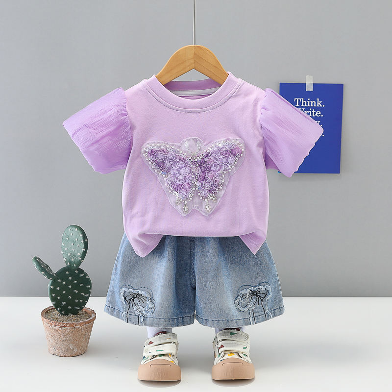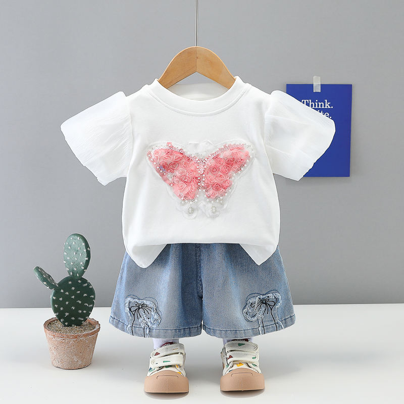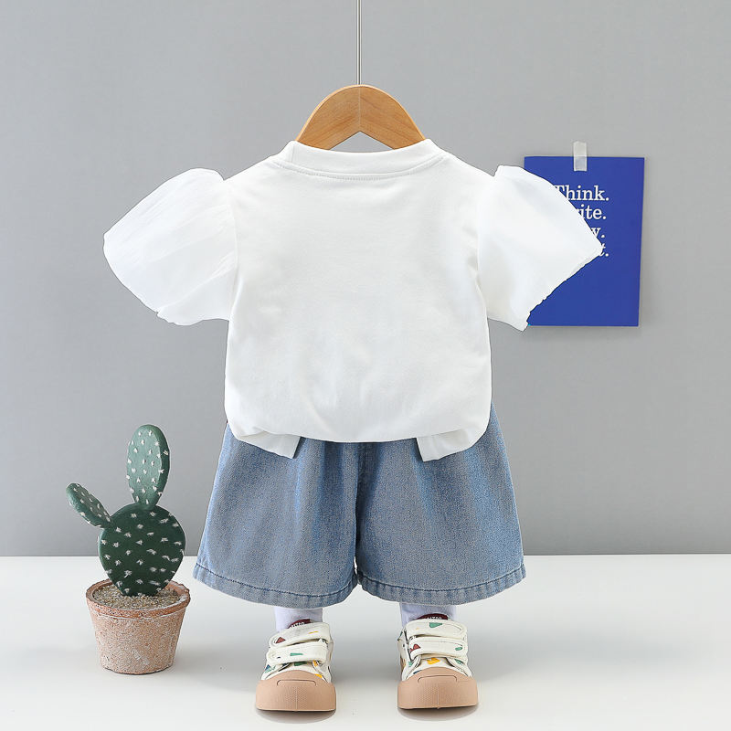 Completo Estivo per Bambina con Stampa Animalier, Stile Coreano Trendy, Logo, Poliestere/Cotone, Manica Corta, Due Pezzi con Pantaloncini, Tuta per Neonata 2026