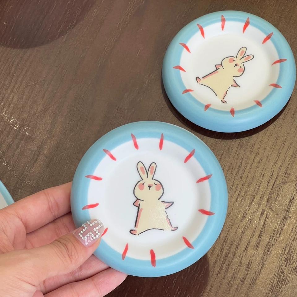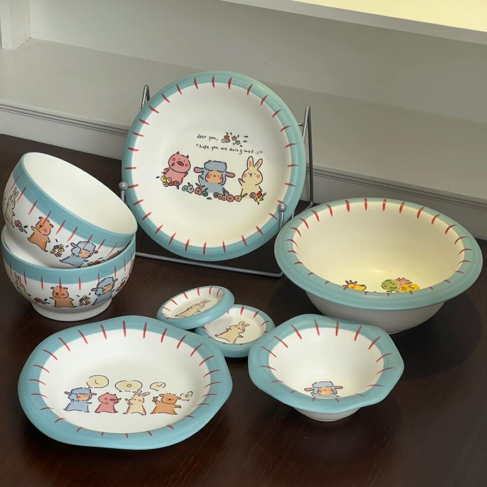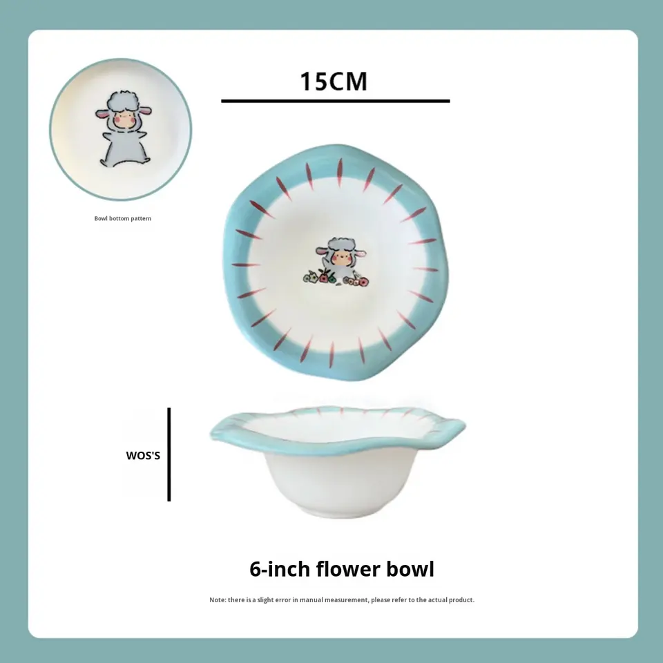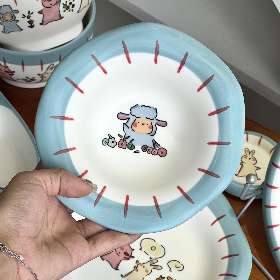 Piatto per Colazione in Ceramica Blu Opaco con Texture, Motivo Agnello Baudelaire, Creativo e Carino per la Casa