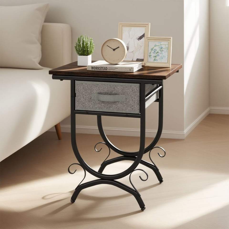 Tavolo Console per Soggiorno con Cassetto in Tessuto e Struttura in Metallo Intagliato, Elegante Tavolino Laterale