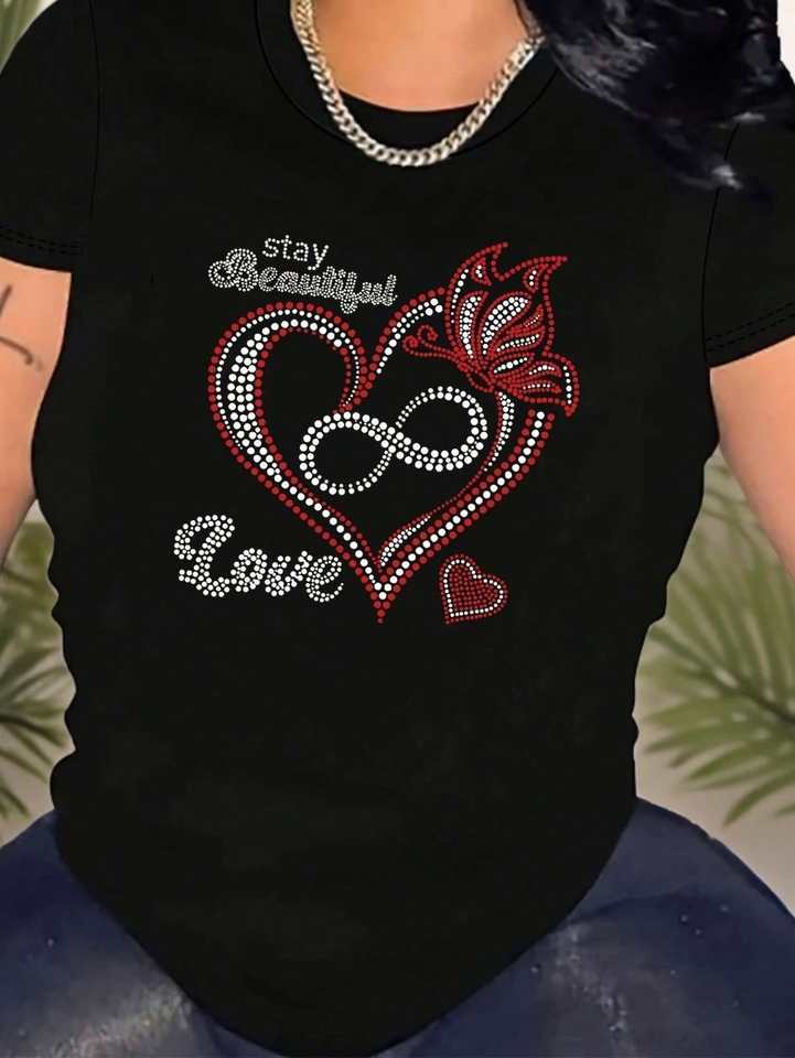 Local Women's Black Round Neck T-Shirt Short Sleeve Regular Fit Rhinestone Heart Design Stay Beautiful Love Valentine's Day