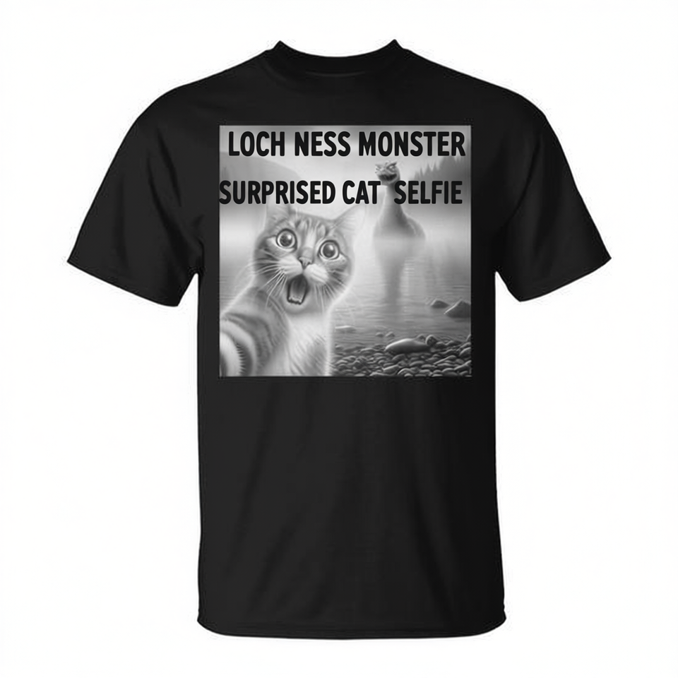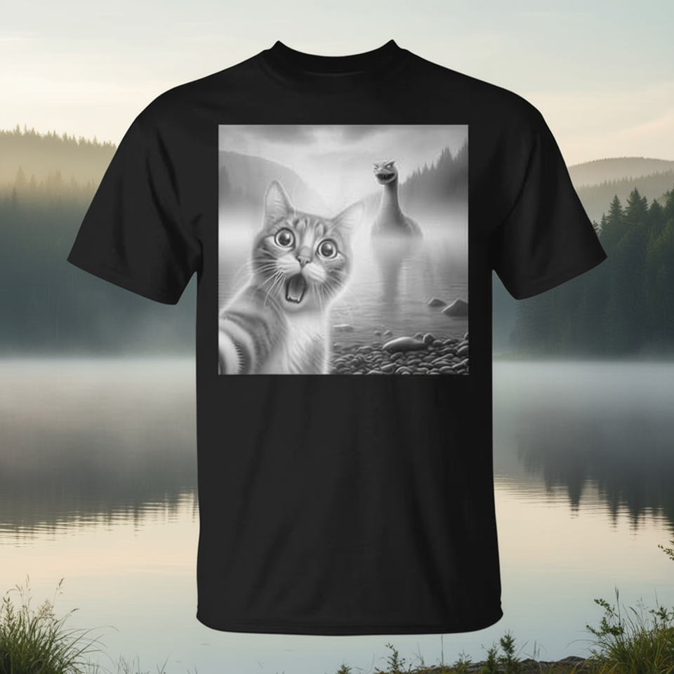 T-shirt con stampa digitale del Mostro di Loch Ness sorpreso per selfie, prodotto promozionale con design intrigante, unisex, a maniche corte