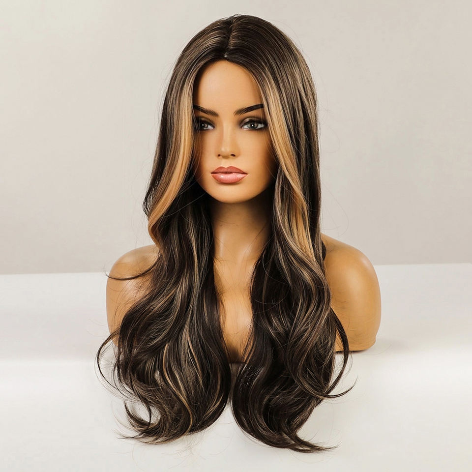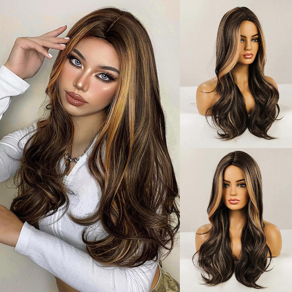 Parrucca Sintetica Lunga Castano Naturale Ondulata per Donne, Resistente al Calore, Stratificata per Uso Quotidiano