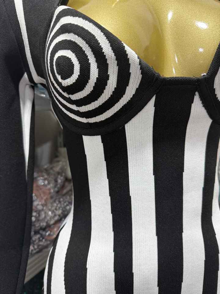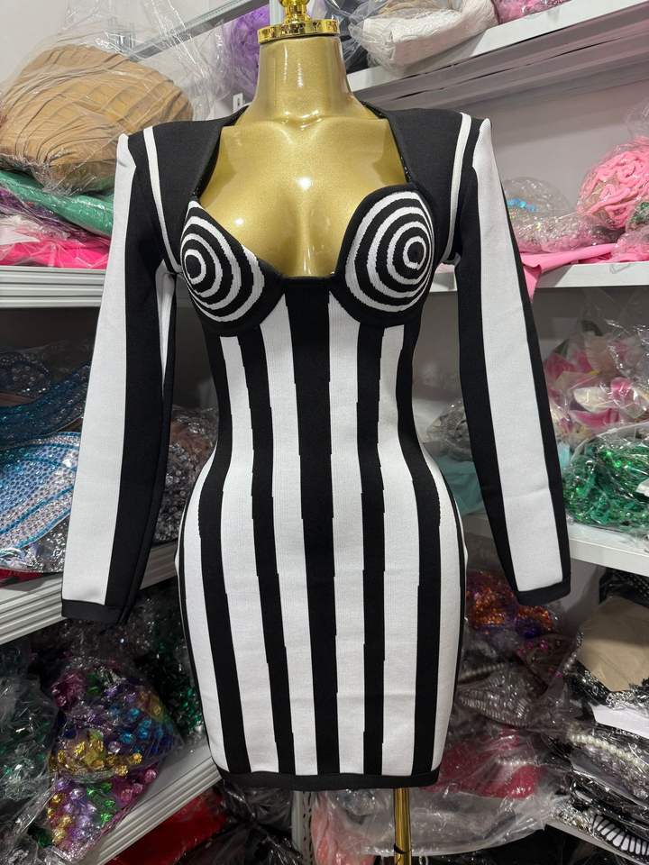 Long Sleeve Bodycon Bandage Gown Trendy Black White Striped Spiral Print Mini Dress for Club Parties Events Casual Gatherings