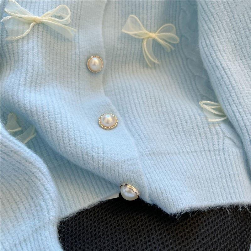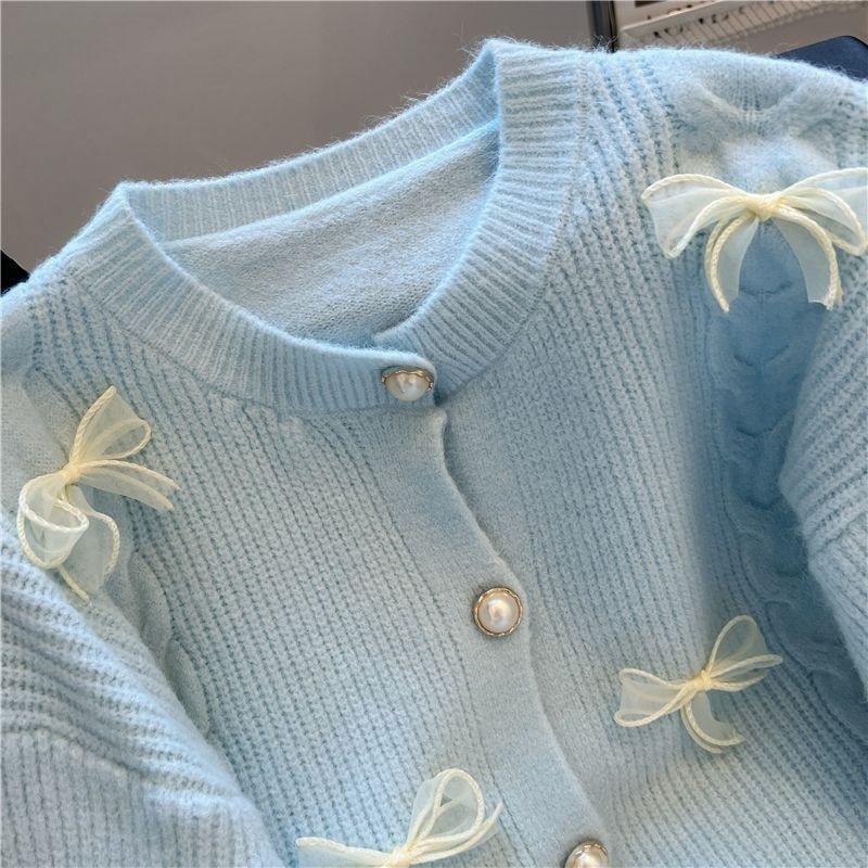 Long Sleeve Knitted Cardigan for Women 2025 Autumn Winter Korean Pink Blue Sweater Top with Bow 2927#