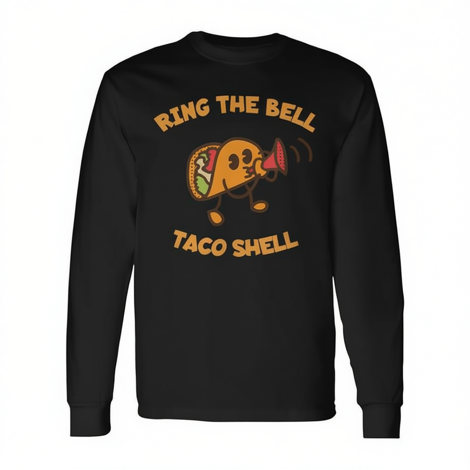 T-shirt a maniche lunghe con design 'Ring the Bell' per amanti e creatori di taco, con stampa a forma di conchiglia di taco per promozioni efficaci