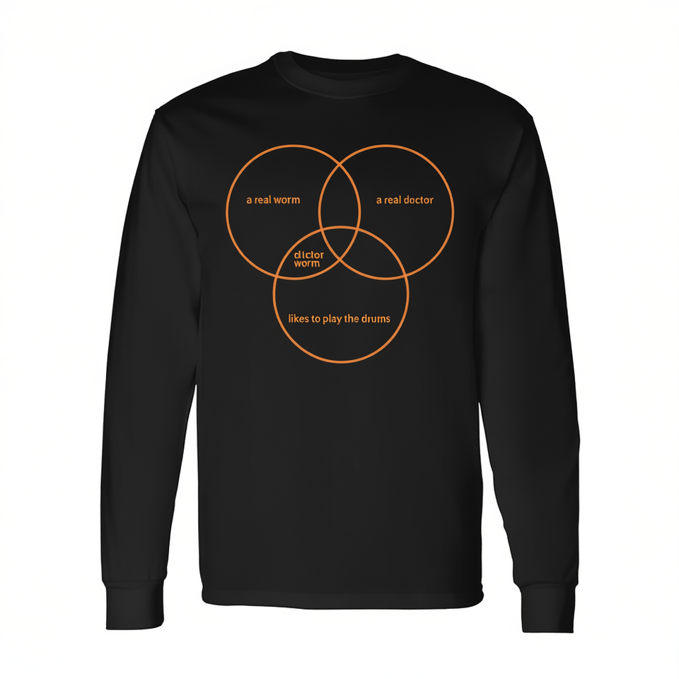 Maglietta a maniche lunghe con design a diagramma di Venn: un vero verme, un vero dottore che ama suonare i tamburi