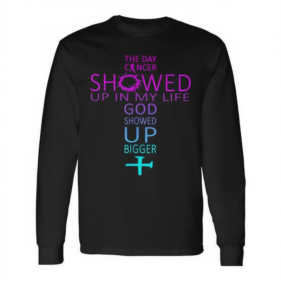 T-shirt a maniche lunghe girocollo con stampa digitale: Il cancro ha mostrato il mio cammino, Dio ha mostrato un design più grande per la consapevolezza sul cancro