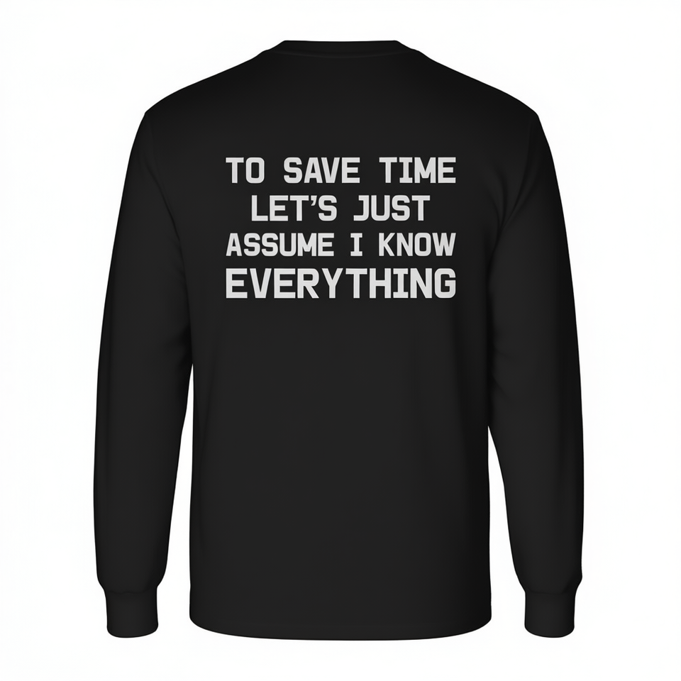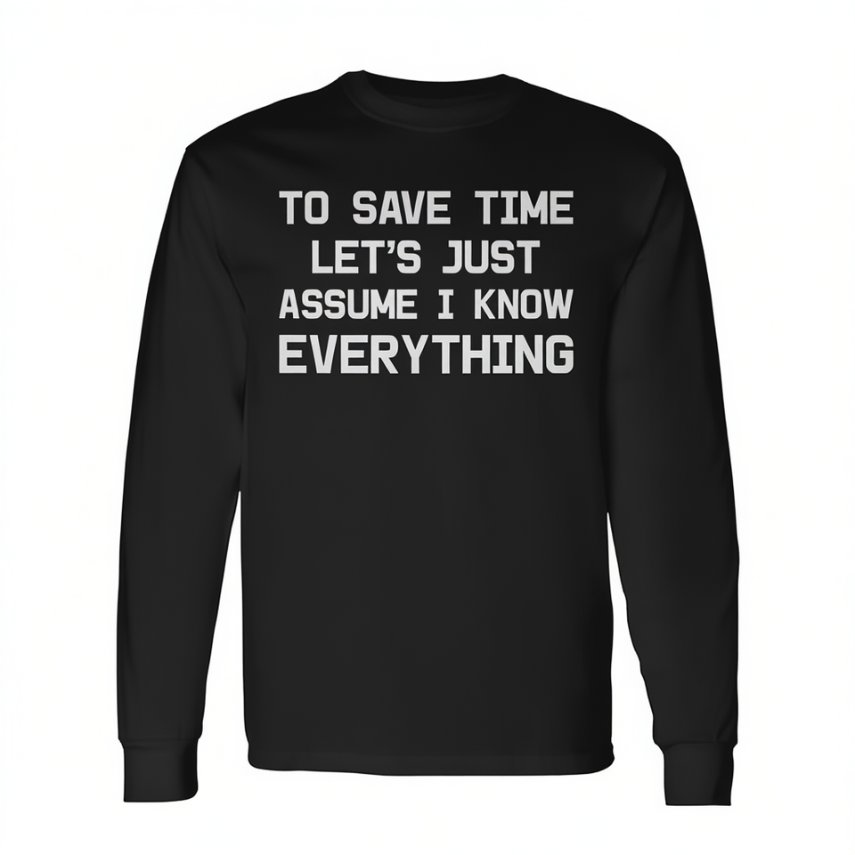 T-shirt a maniche lunghe per risparmiare tempo. Supponiamo che io lo so tutto. Maglietta grafica per adulti, unisex, girocollo, stampa serigrafica.