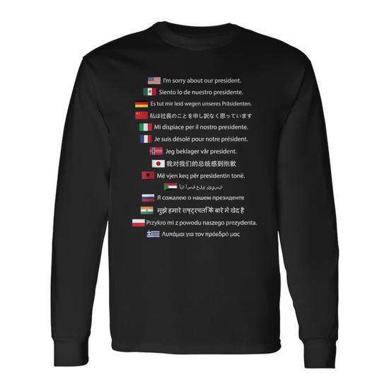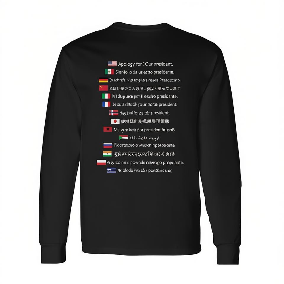 Maglietta a Maniche Lunghe con Scritta 'Scusa per il Nostro Presidente' in Tutte le Lingue per Scopi Promozionali