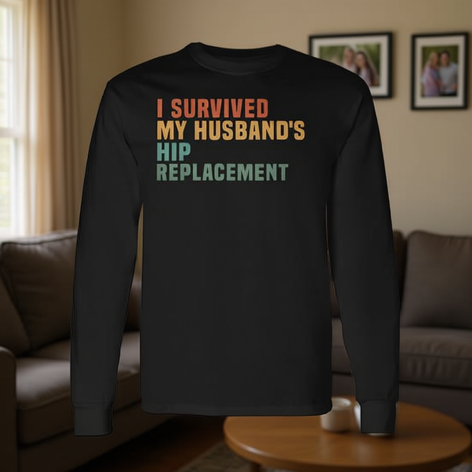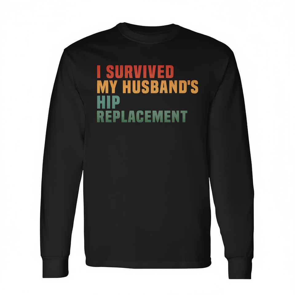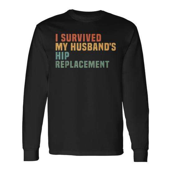 Maglietta a maniche lunghe con grafica 'Sono sopravvissuto alla sostituzione dell'anca di mio marito' - Maglietta promozionale di supporto per la chirurgia dell'anca