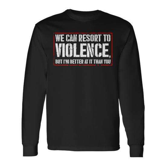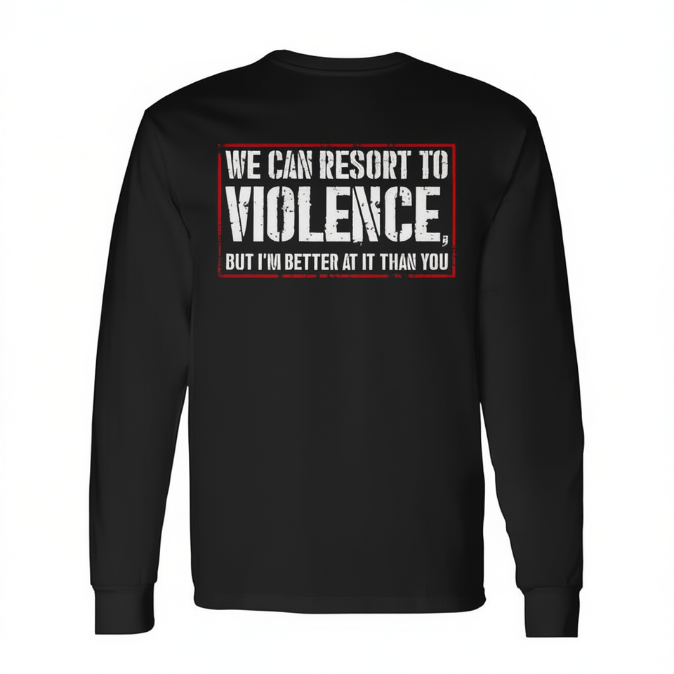 T-shirt a maniche lunghe con stampa 'We Can Resort to Violence but I'm Better at It' e grafica posteriore 'Better Violence', prodotto promozionale