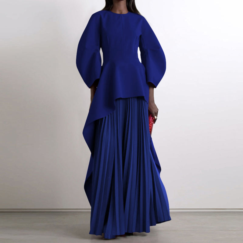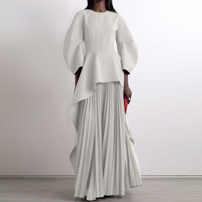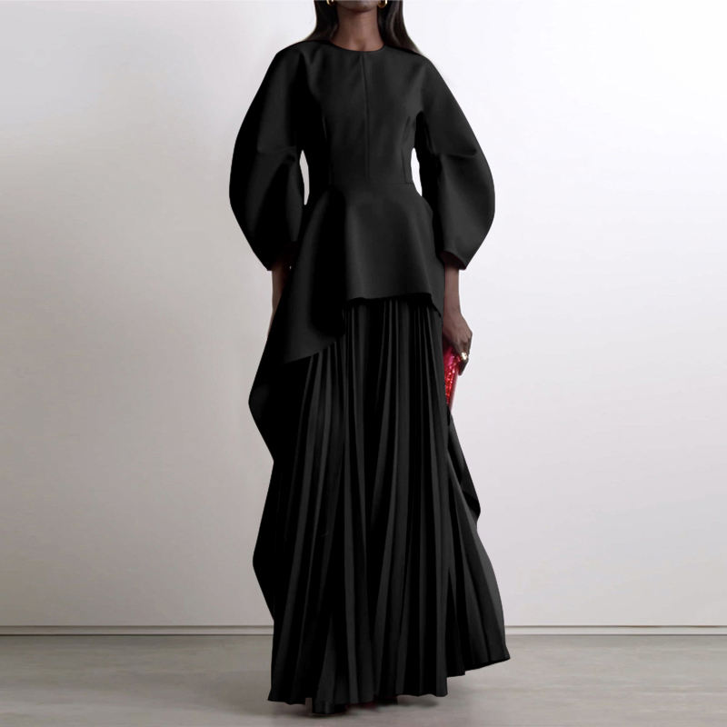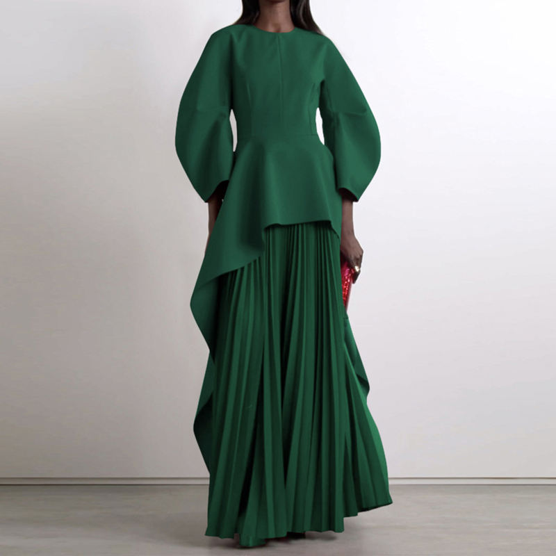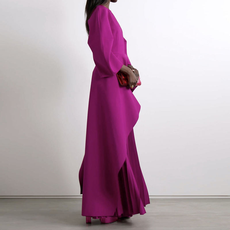 Abiti Lunghi da Donna con Maniche Lunghe, Collo a Barchetta, Stampa Digitale Eco-Friendly, Colore Unito, Plissettati, a Strati e con Dettagli a Giunzione