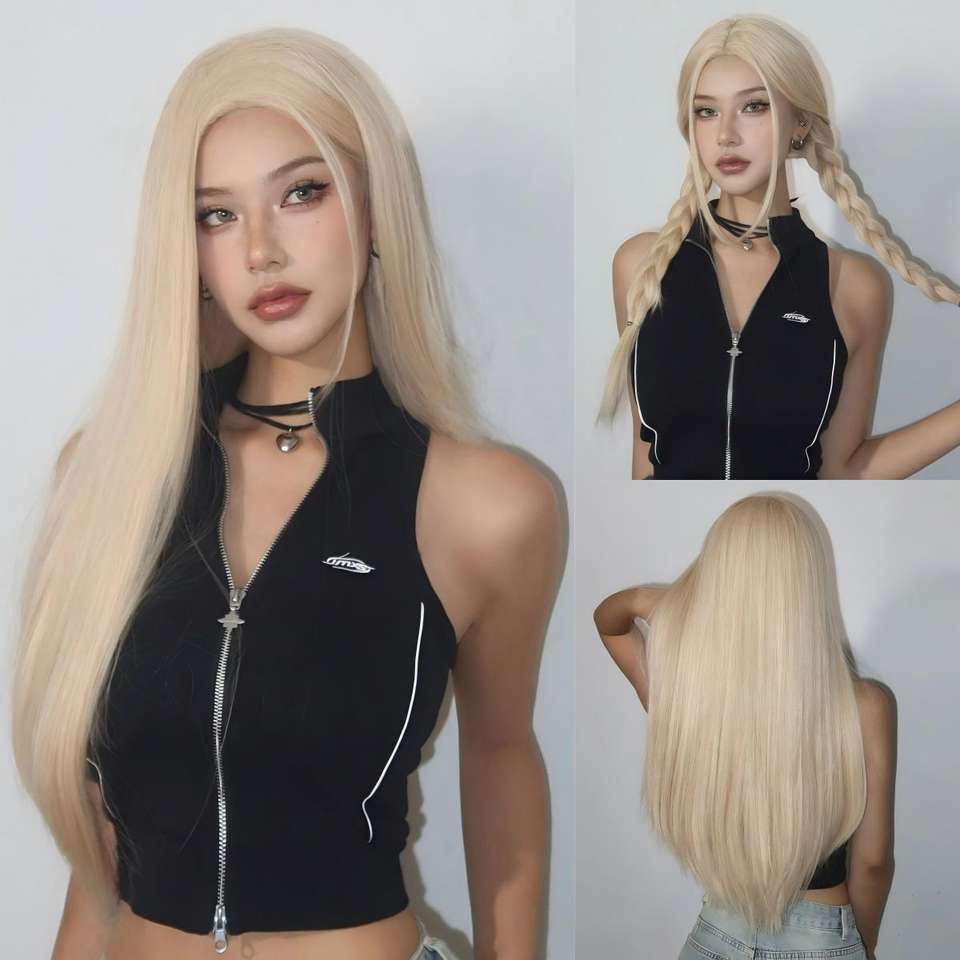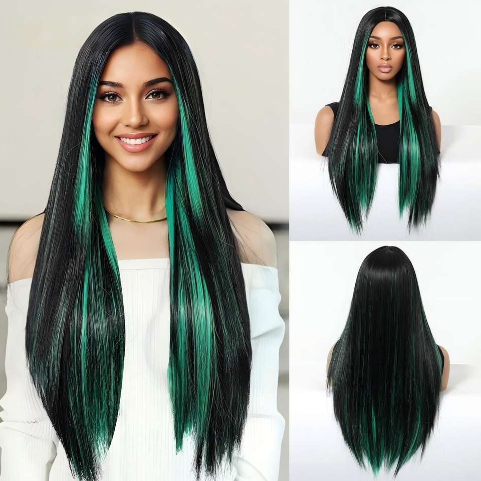 Parrucca Lunga Liscia con Partizione Centrale Senza Frangia, Naturale e alla Moda, in Fibra Resistente al Calore, Senza Colla, con Rete a Maglia Rosa, Copertura Completa, Super Venduta