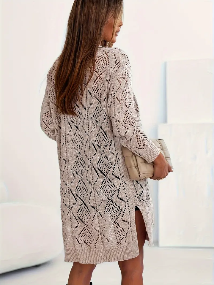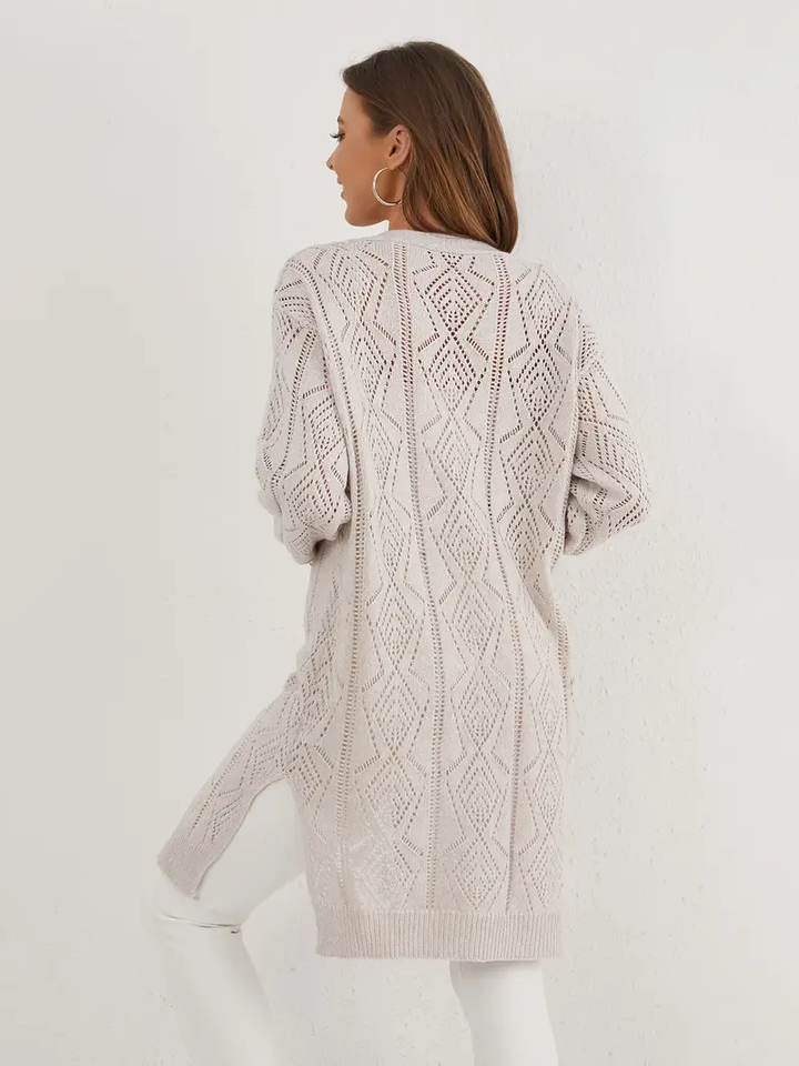 Loose-Fit Relaxed-Style Long-Sleeved Openwork Maxi-Length Women's Plus-Size Knitted Cardigan