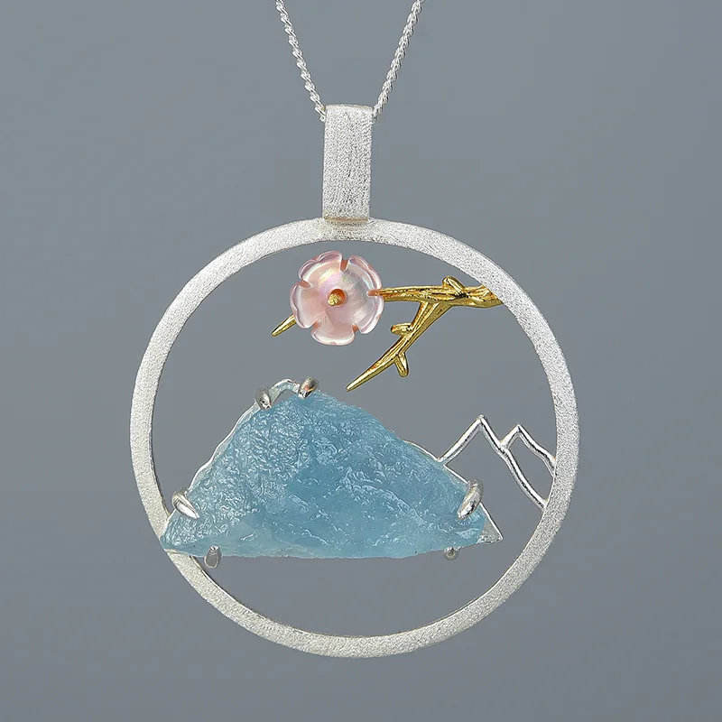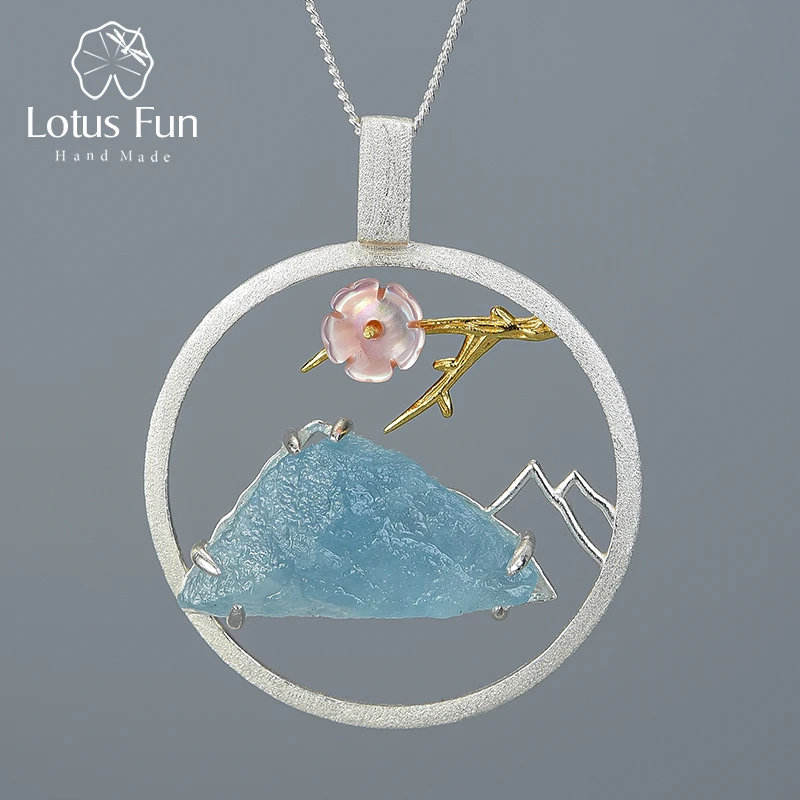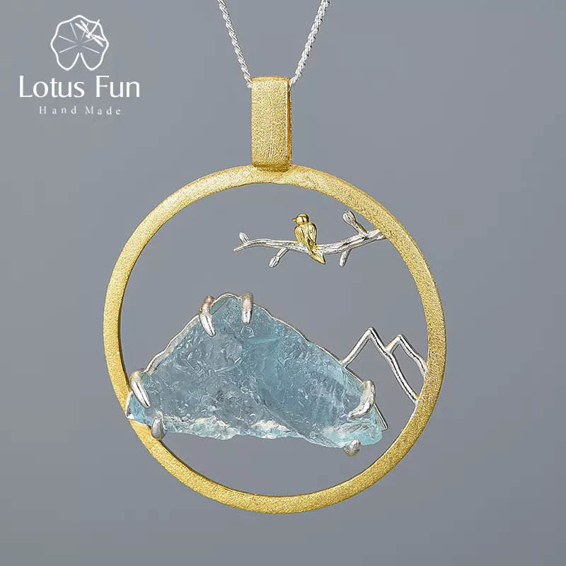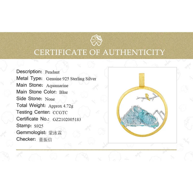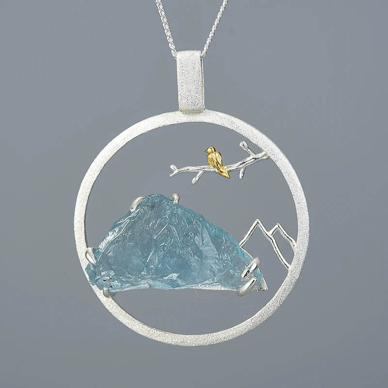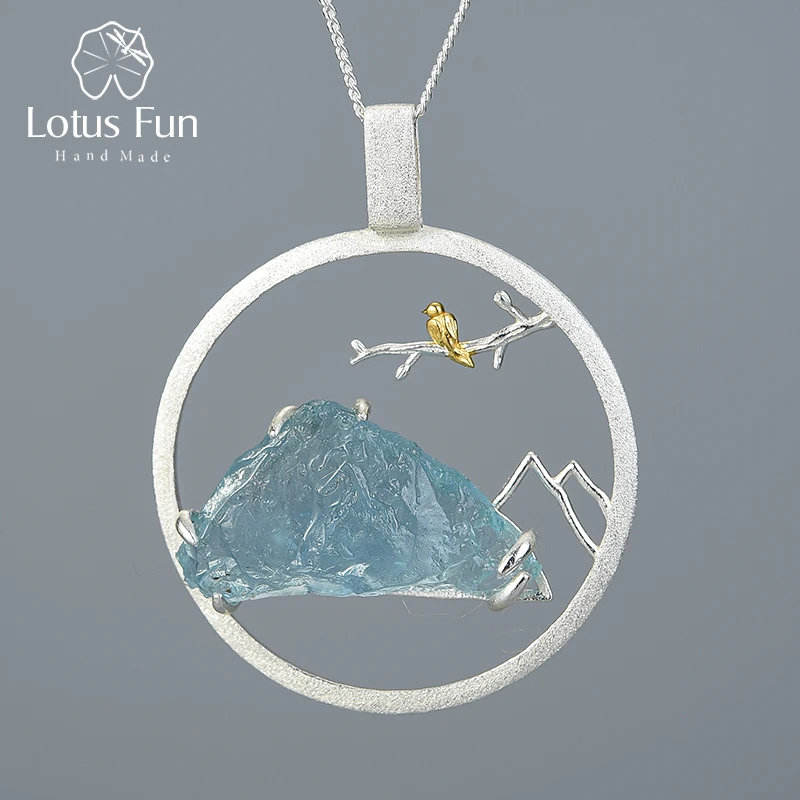 Lotus Fun Bird Whisper Slide Silver Animal Design Natural Raw Stone Religious Style Charm Necklace with Aquamarine